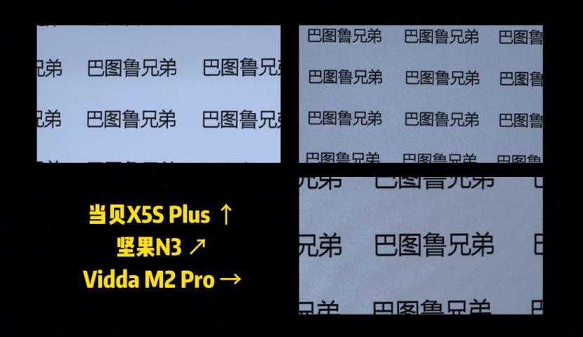亮度方面,当贝的实测亮度为1911lm流明,坚果的实测亮度为1606lm流明,Vidda的实测亮度为1327lm流明。至于分辨率方面,三款都支持4K分辨率,清晰度都不错。