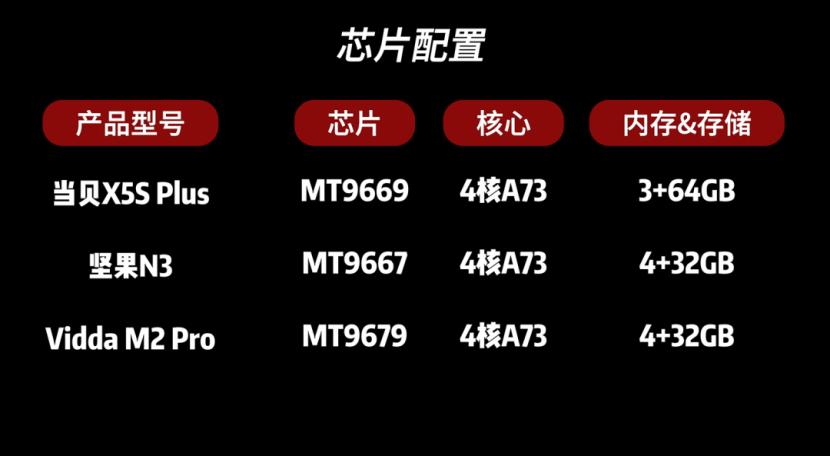 当贝X5S Plus搭载的是MT9669芯片,配备了3G+64G的存储容量。坚果N3搭载的则是MT9667芯片,配备了4G+32G的存储容量。Vidda M2 Pro搭载的则是MT9679芯片,同样配备了4G+32G的存储容量。