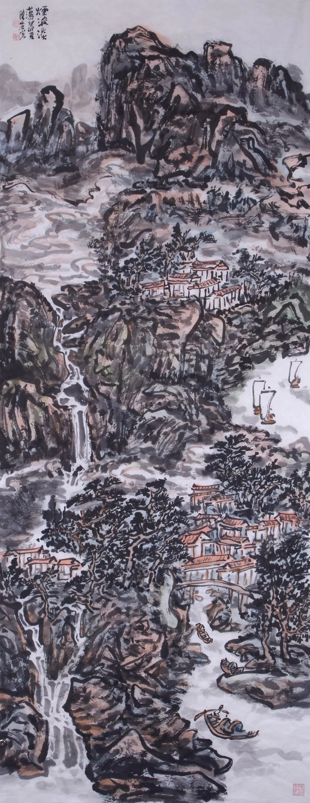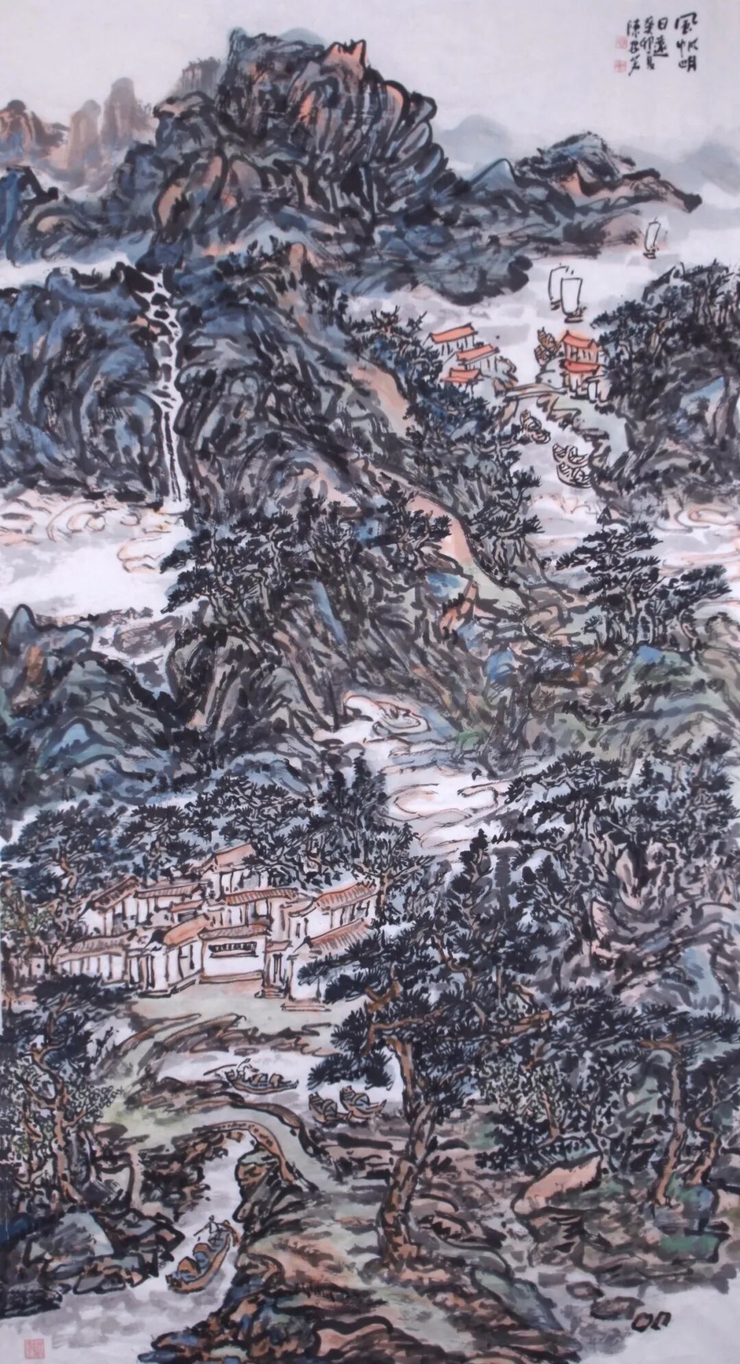 应物象形,笔笔见形如站桩守形“应物象形”是中国画的基础法度,更是陈安茗山水画“笔笔有意”的前提,其笔笔见形的严谨,暗合太极站桩“守形、正形、固形”的核心要求。太极站桩首重身形端正,头正、肩松、腰沉、步稳,每一处身形姿态都有法度,唯有身形稳固,意念才能凝聚、内气才能顺畅,这与山水画“笔笔见形、形准意生”的法理一脉相承。陈安茗始终坚守应物象形,笔笔见形的创作准则,以精准的笔墨造型还原自然山川的本真形态,如同站桩时严守身形规范,让每一笔都有其对应的物象,每一点画都有其存在的意义,绝不做无意义的笔墨堆砌。他常年游历名山大川,师法自然,细致观察山川万物的形态肌理,将自然物象的结构、质感、神韵烂熟于心,再通过笔墨精准呈现,恰似站桩者对自身身形的精准把控,不偏不倚、中正规矩。在其作品中,山石的皴法兼具斧劈皴的刚劲与披麻皴的温润,林木的枝干虬曲自然、疏密有致,流水的线条婉转流畅、动静相宜,云烟的晕染虚实相生、空灵悠远。每一笔勾勒、每一次皴擦、每一遍点染,都紧扣物象形态,既符合自然规律,又饱含笔墨意趣,实现了“形真”与“笔精”的统一。正是这种如站桩守形般扎实严谨的造型功底,让他的山水画既有自然山川的生动质感,又有传统笔墨的法度严谨,为“笔笔有意”筑牢了造型根基。