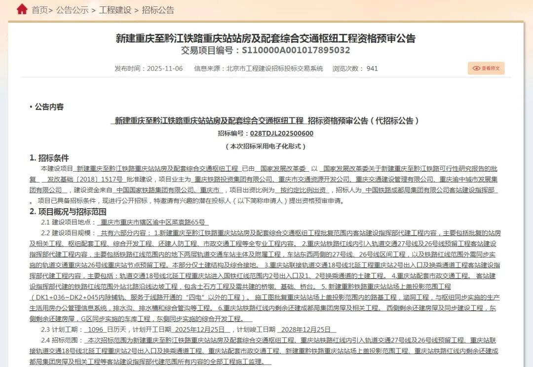 2025年11月,北京市公共资源交易服务平台发布招标公告,明确新建重庆至黔江铁路重庆站站房及配套综合交通枢纽工程将于2025年12月25日全面开工。