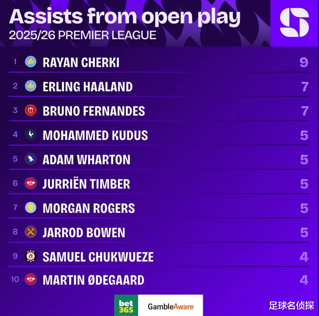 注意这是运动战助攻,前两名是曼城的切尔基和哈兰德。切尔基这个赛季很生猛,我想枪迷对他在卡拉宝杯决赛中的表现印象深刻,曼城战胜切尔西的比赛,切尔基再次发挥了重要作用。