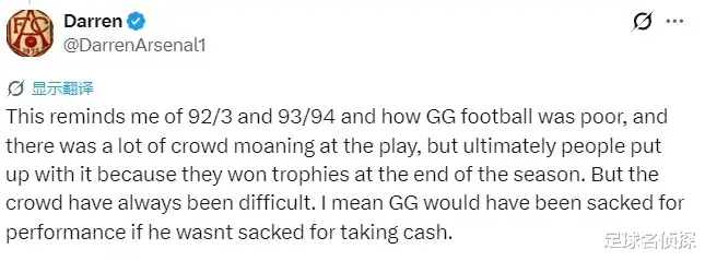 关于阿森纳目前踢球风格在枪迷间引起的“文化之争”,此前阿森纳的小股东以及知名枪迷KOL,推主Darren表示:目前的情况让他想起了92-93以及93-94赛季,当时乔治-格拉汉姆的足球非常丑陋。观众当时对比赛有很多抱怨(所谓“闷蛋阿森纳”时期),但最终人们还是忍了,因为赛季末他们赢得了奖杯。但观众一直都很挑剔。当年乔治-格拉汉姆即便不是因为收受现金(球员转会中收好处费了)问题被解雇,也有可能因为球队糟糕的打法被炒鱿鱼。