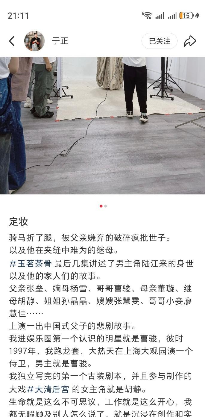 于正还透露,曹骏的新角色是一个骑马断了腿、被父亲嫌弃的破碎疯批世子,也就是男主哥哥。这个角色会在最后几集揭晓男主陆江身份时才出现,会上演一出中国式父子的悲剧故事。