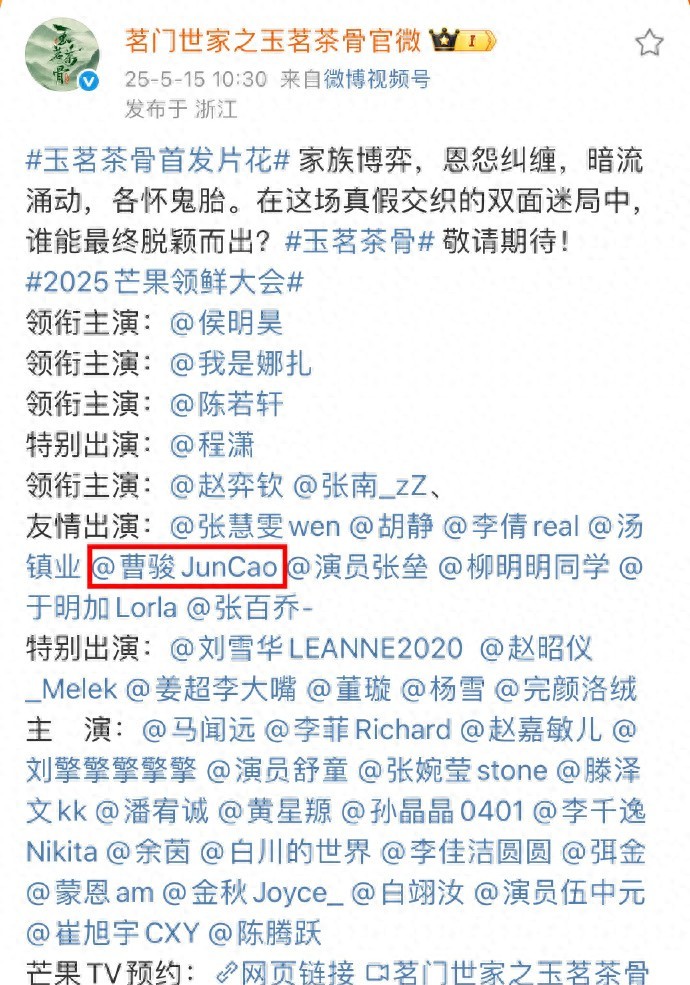 因为一部《无忧渡》,曹骏再次翻红。于正这个老戏骨怎么会错过这一波流量呢?他先在社交平台说旗下艺人张南赵昭仪每天都在他耳朵边念叨着曹骏的好处,前段时间新剧首发片花,官微上赫然写着曹骏的名字,还明确标注为友情出演。