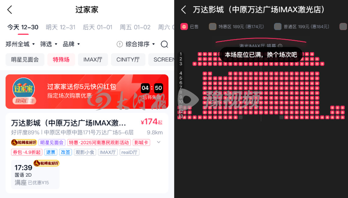 大河报·豫视频记者从猫眼购票平台获悉,12月30日17:39,万达影城(中原万达广场IMAX激光店)《过家家》特殊场次门票已全部售罄,页面标注“映后见面会,到场明星:成龙、李萍、潘斌龙(以实际到场为准)”。随后,中原万达客服向记者确认:“确实是成龙本人会来,电影结束后有短时间见面会。”淘票票客服也回应:特殊场次标注明星见面会,“一般会有明星到场”。