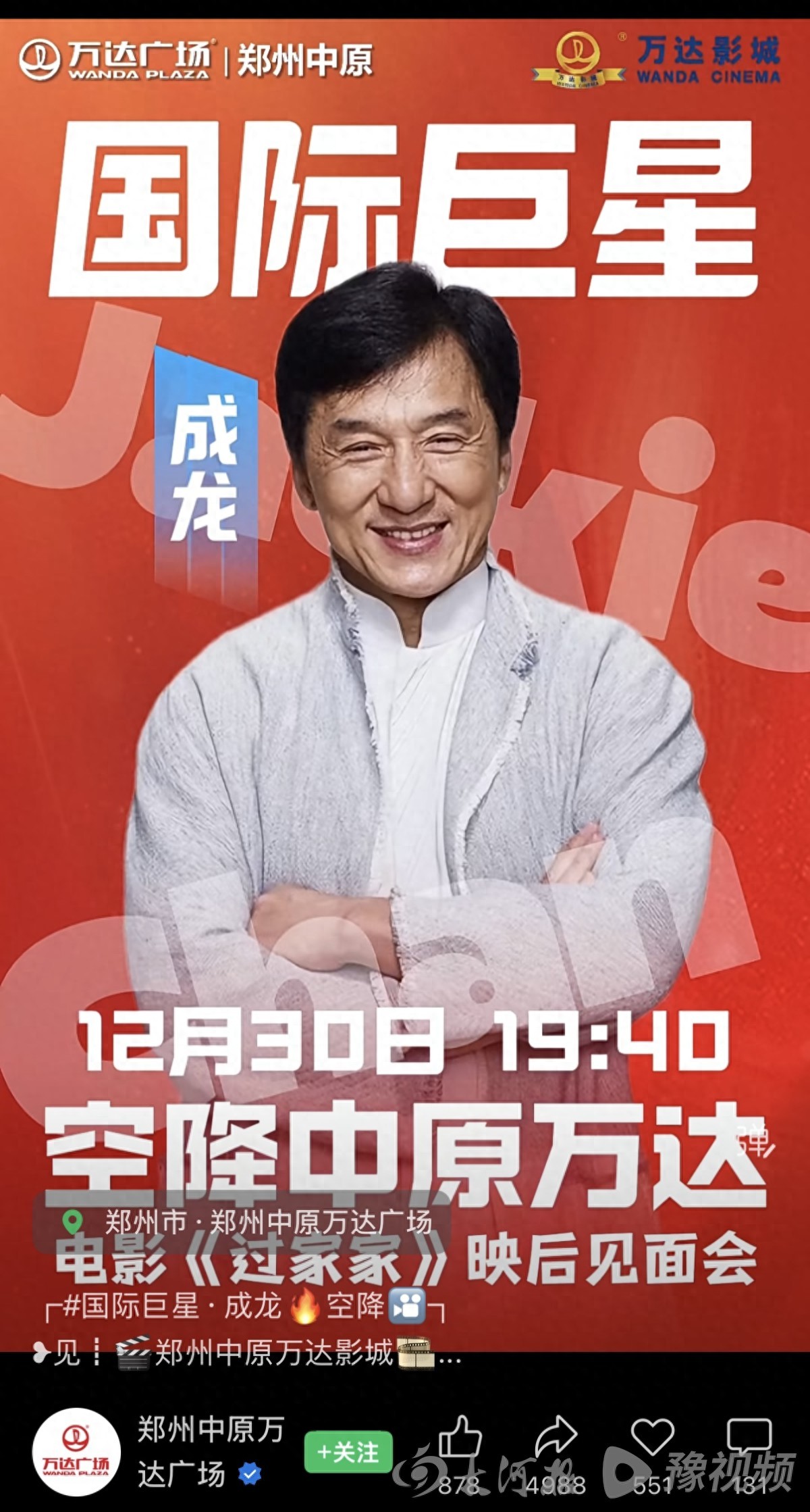 国际巨星成龙要来郑州了?这次是真的!近日,郑州中原万达广场通过视频号释放消息:12月30日19:40,成龙将现身商场,参加电影《过家家》映后见面会。消息一出,网友纷纷“蹲真相”,不少人留言:“真的假的?能亲眼见到大哥?”