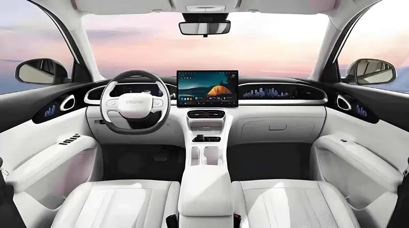 内饰部分,采用对称式座舱布局样式,提供8.8英寸液晶仪表盘、悬浮式中控屏、平底式双辐多功能方向盘等,中控台副驾位置及车门内衬处带有城市楼宇图形装饰。车机系统进行升级,14.6英寸悬浮中控屏搭载Flyme Auto车机系统支持连续对话的语音控制,并能实现手机无线投屏及魅族手机无缝流转功能。动力依旧保持后驱单电机。