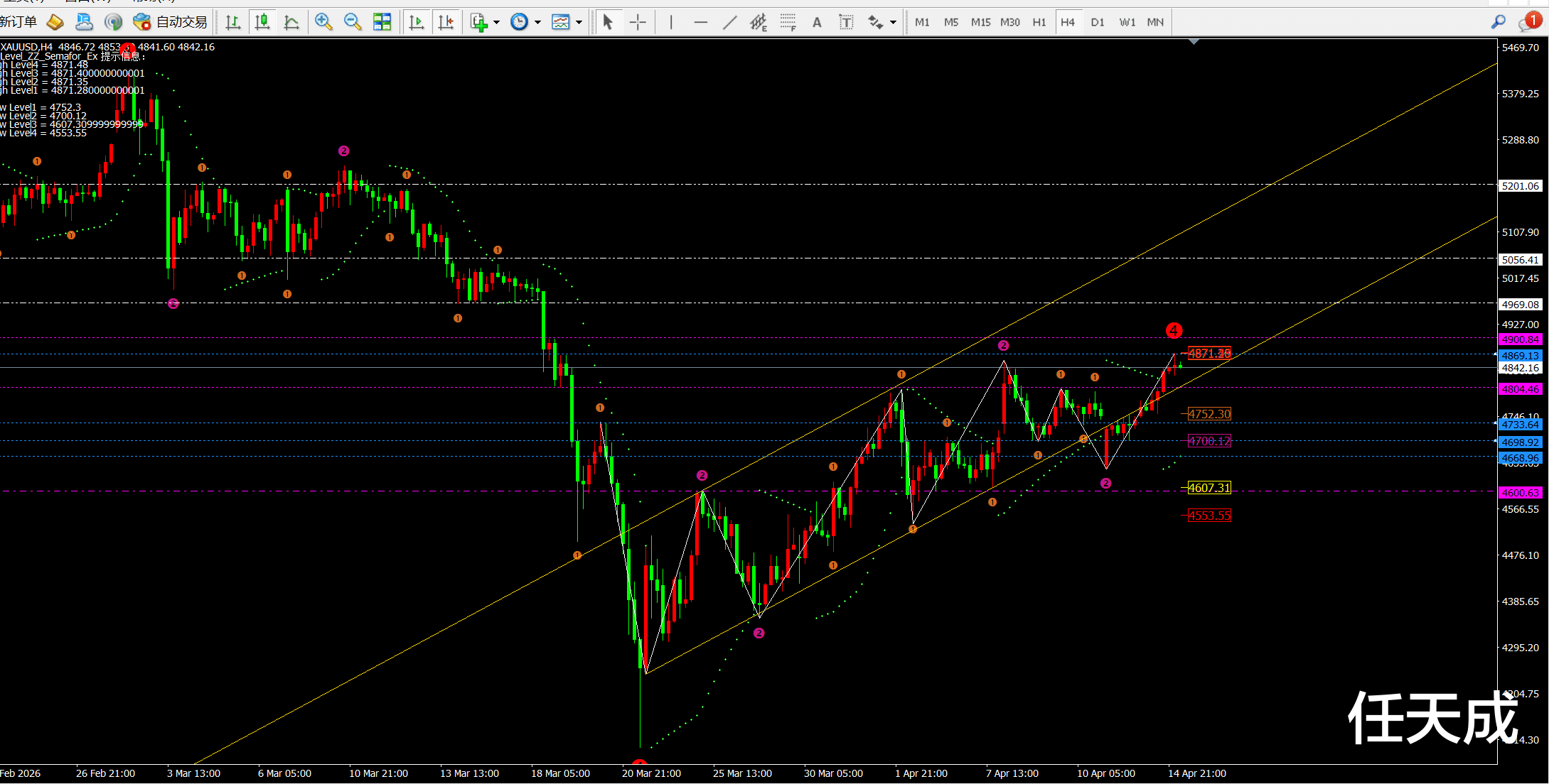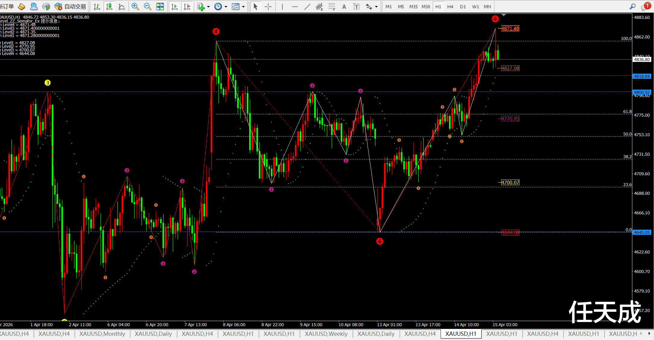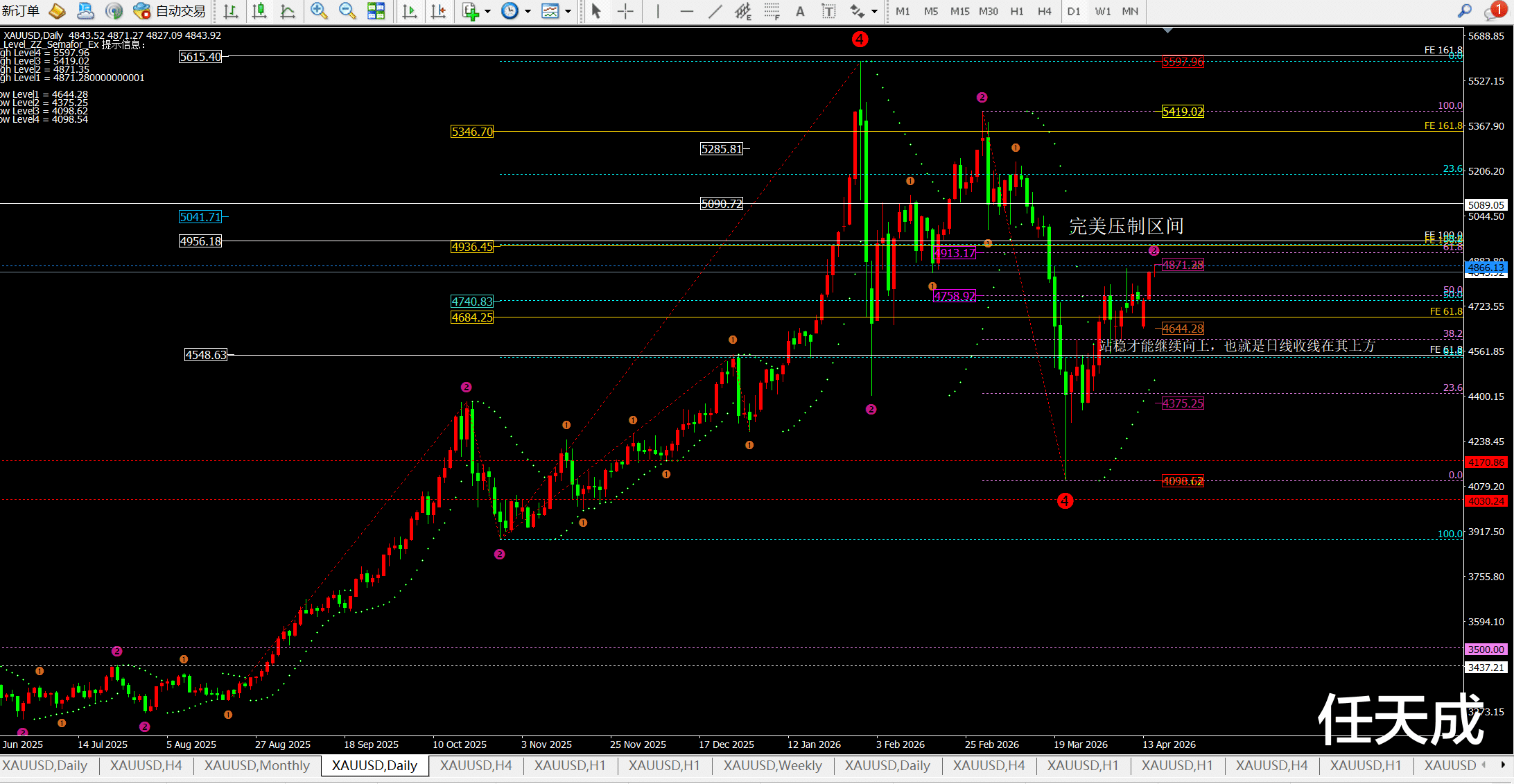 日线前期是跌破4970一线开始大跌,而目前的斐波拉契回调线也压制在4910-4960这一带。4小时图也是超级明显压制4900和4970一线以及5050-70附近,短期阻力4867一线。