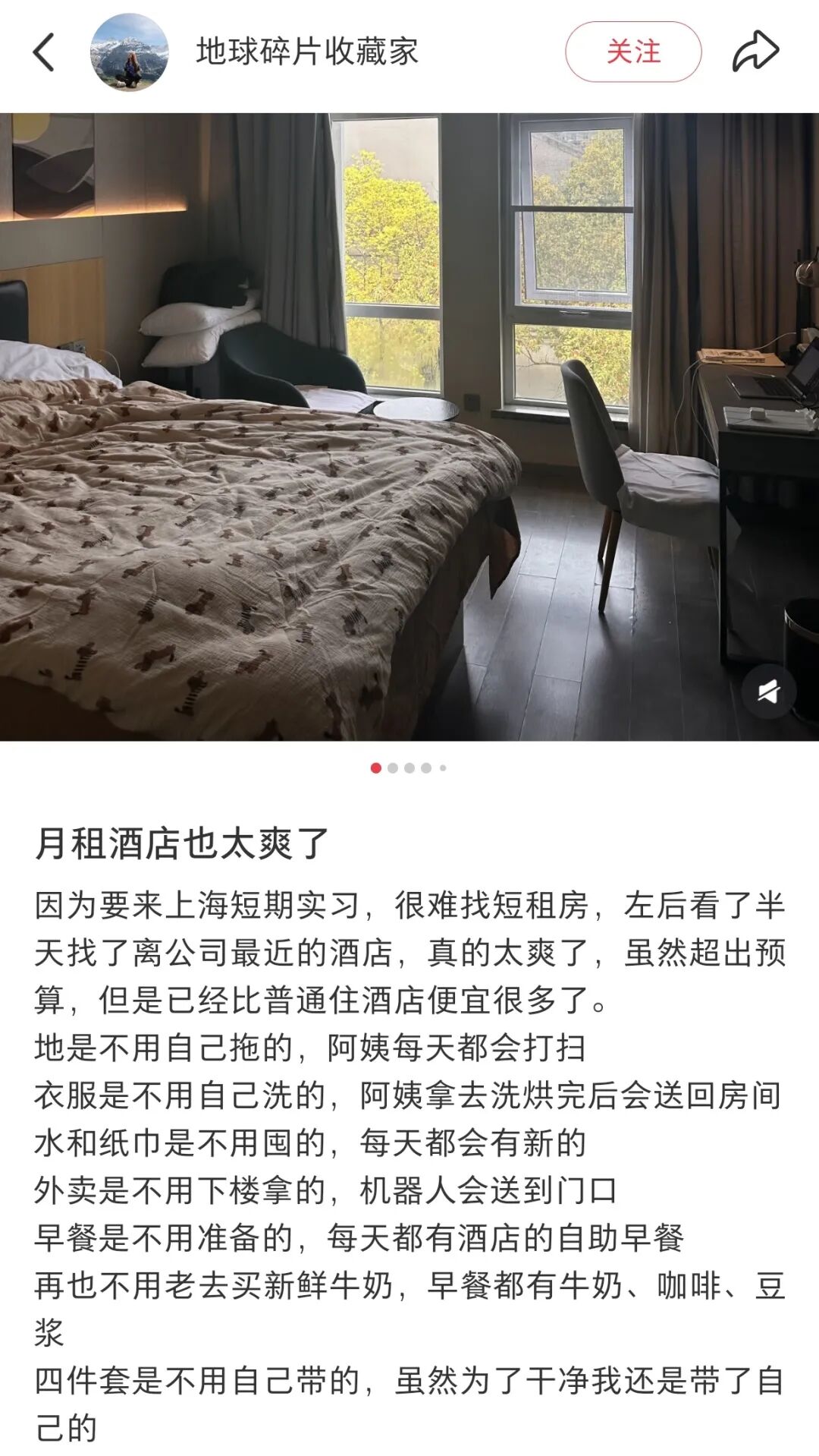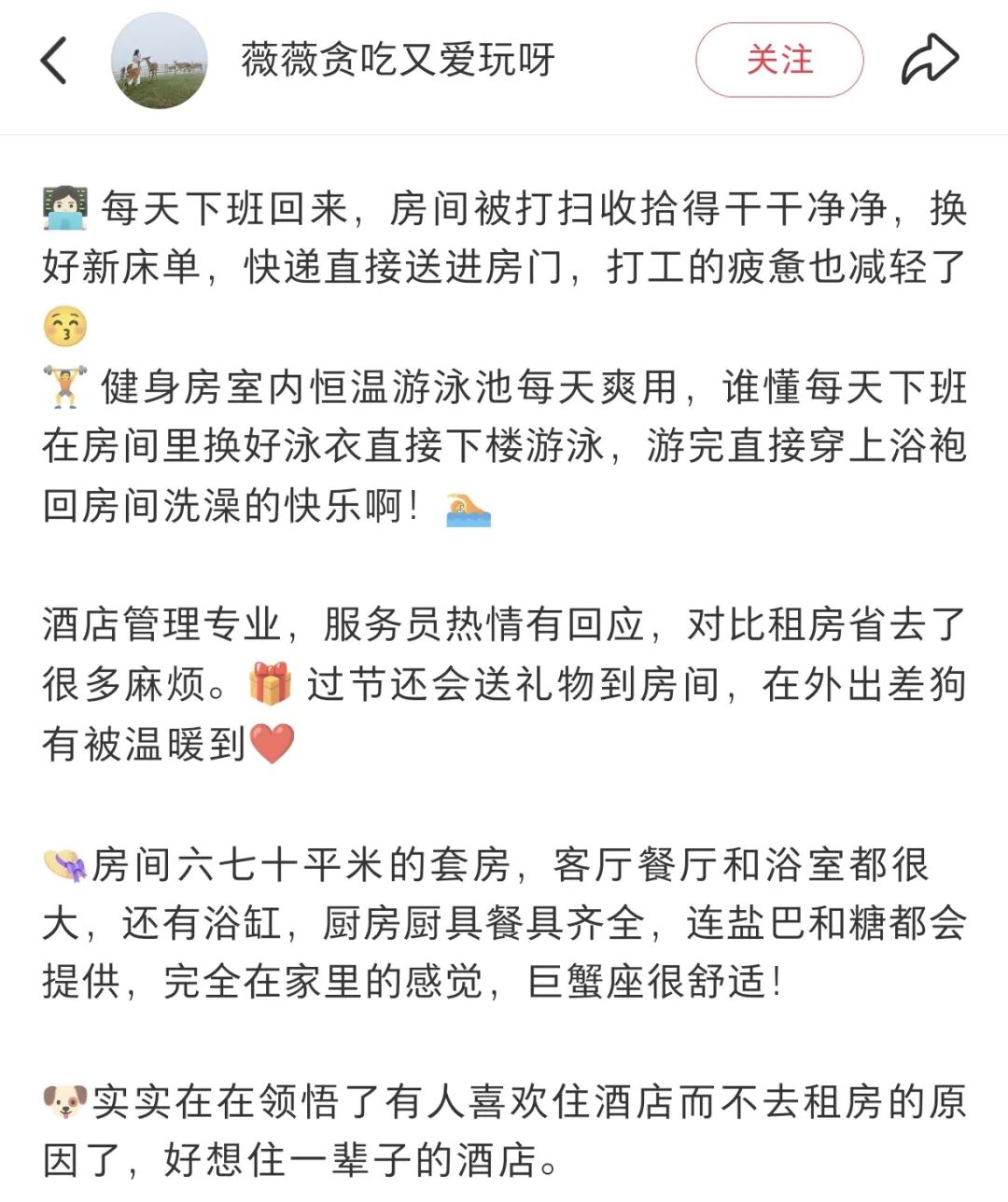 对于住客而言,这笔账更关乎生活品质与灵活性。在社交媒体上,一位长住半年的数字游民晒出了他的账单:房费看似比同地段租金高,但省下了通勤费、健身房会员费、保洁阿姨的费用,甚至大部分的餐饮开销(早餐吃饱,下午茶用好,晚饭常常就省了)。