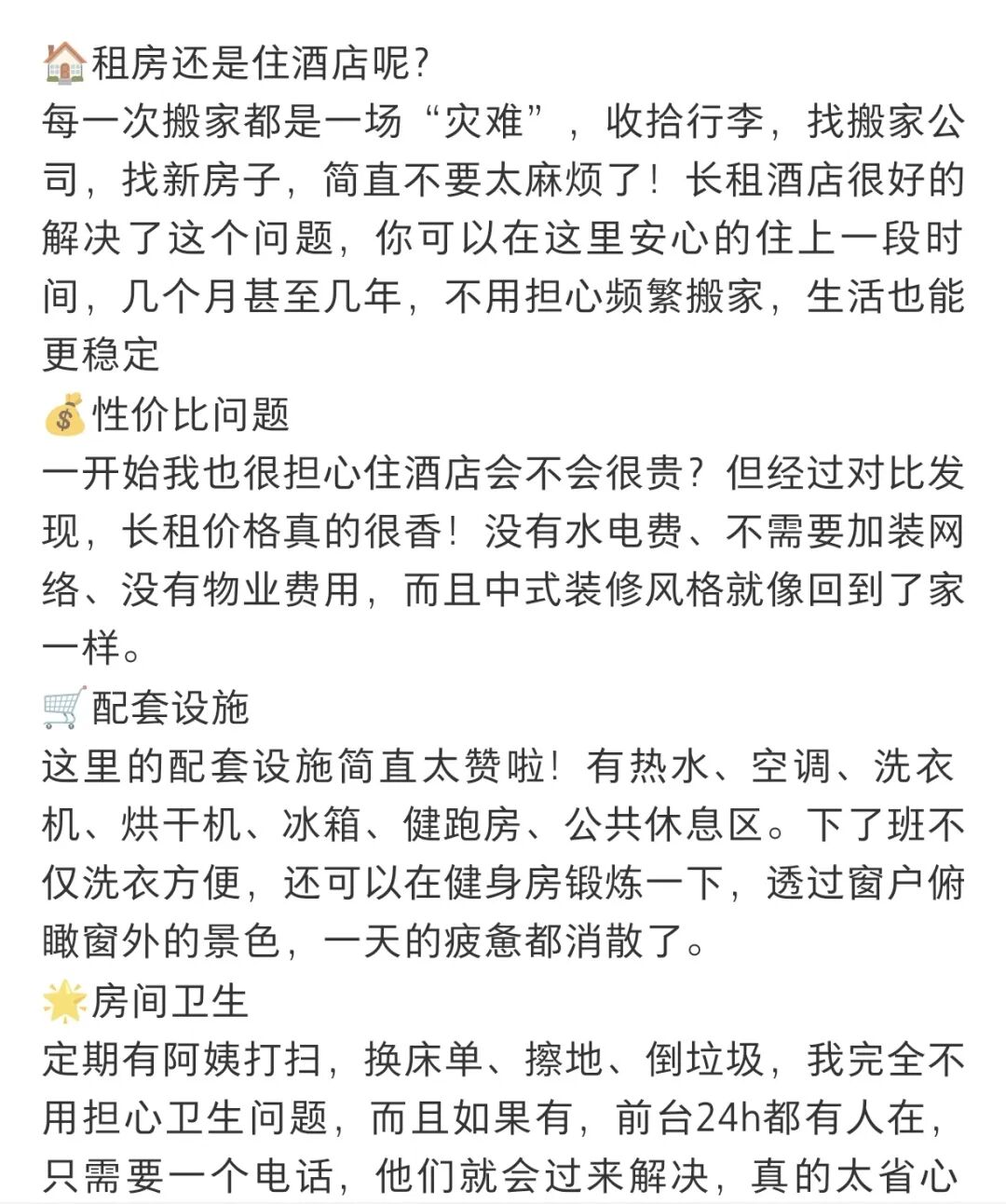 长住酒店的魅力,恰恰在于它将这种“幸福感细节”日常化了。你不再需要与洗衣机维修工周旋,不用在加班后面对一池脏碗,生活里那些磨损人的琐碎被悄然抹去。当“家务”这个词从你的字典里消失,多出来的时间和精力,便成了生活宝贵的呼吸感。