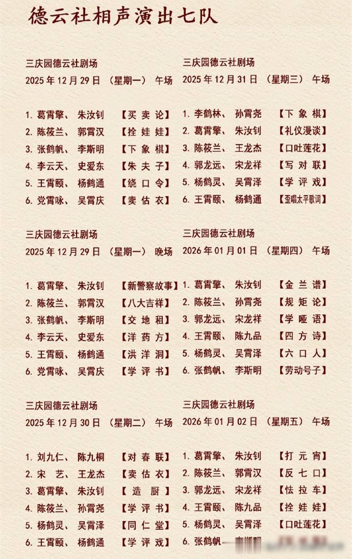 德云社这周的小剧场排期一出来,网上就热闹起来了,12月31号那天,七队压轴的是王霄颐和杨鹤通,倒数第二是杨鹤灵和吴霄泽,不过这两个人本来不是七队的,是四队的演员,开场的李鹤林、孙霄尧也不是原来的队员,到了元旦那两天,七队能认出来的老演员更少了,张鹤帆、李斯明这些四队的都来帮忙,只有党霄咏、吴霄庆几个人还在队里,周二午场的情况更加明显,只剩下葛霄擎、朱汝钊、陈筱兰三个原配演员,其他全是外面来的。