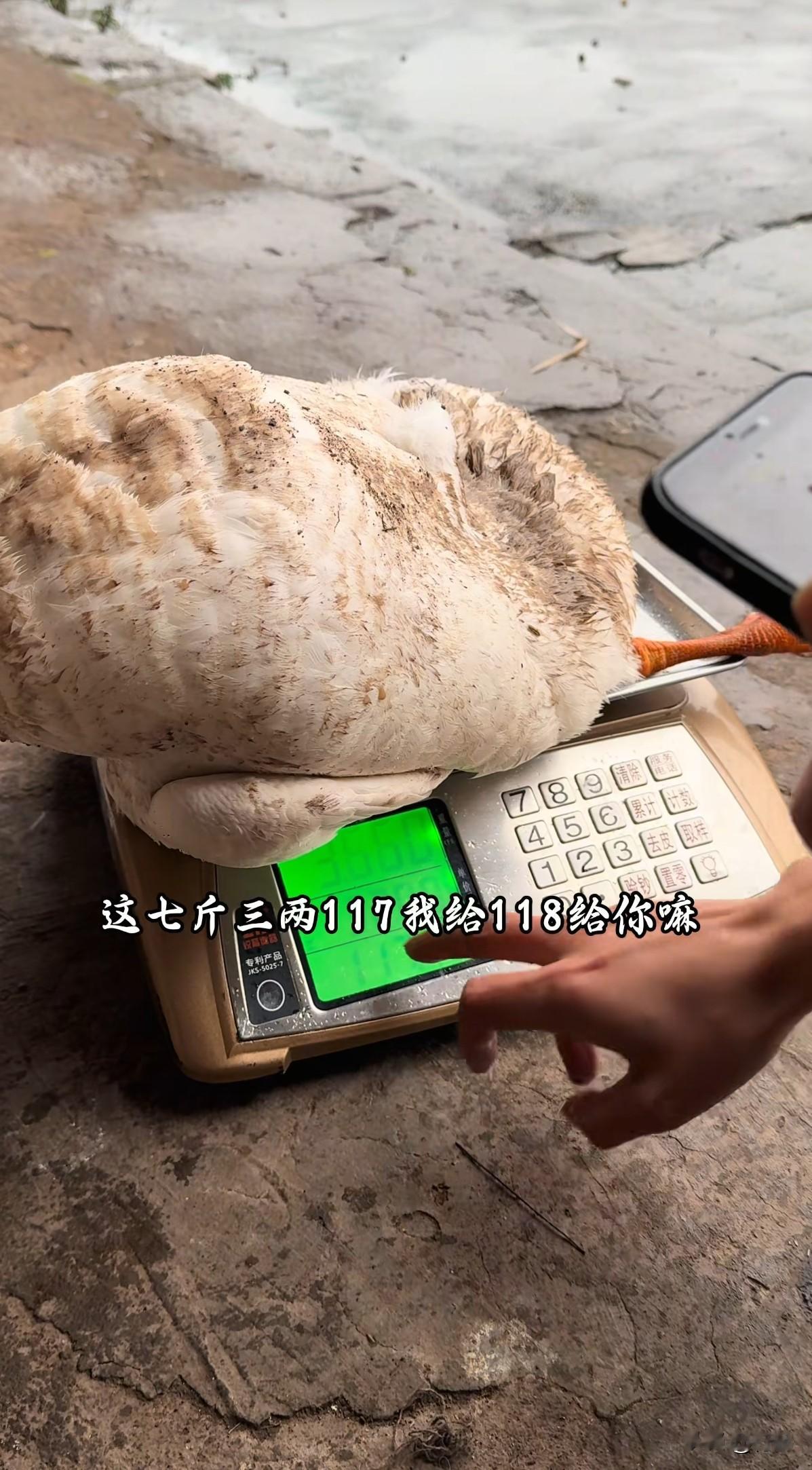 他当着老人的面称了鹅的重量——七斤三两,按市场价计算价值117元。小曹主动表示给118元,最终付款时直接给了120元。