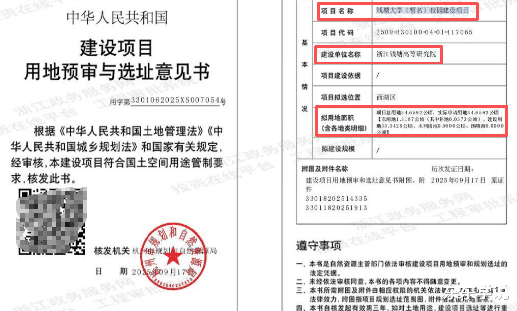 从网络上流传的图片看,建设单位浙江钱塘高等研究院,获批了超34公顷的一块建设用地,换算后约有520亩;用于建设“钱塘大学(暂名)”。