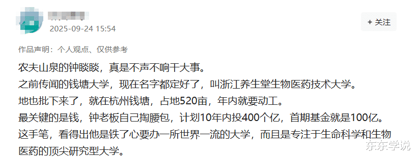 农夫山泉创始人,前首富钟睒睒拟投资400亿建设的“钱塘大学(暂名)”,经过一段时间的筹备后,在9月份终于传来落地的消息。