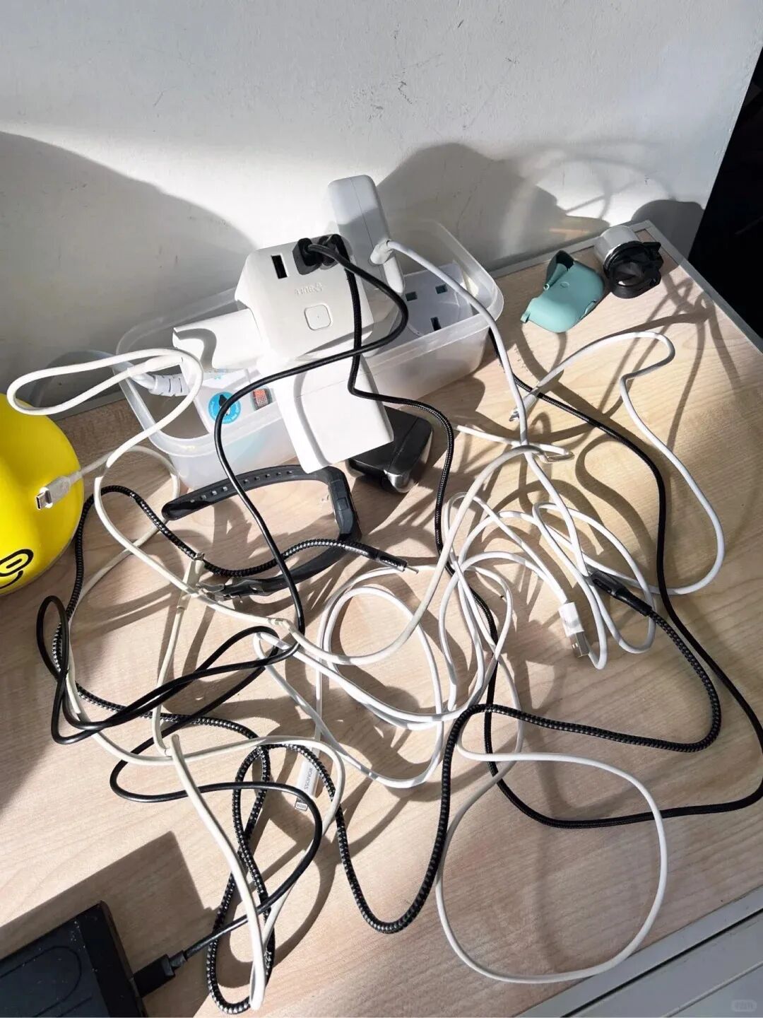 我家就是这样,晚上在充电器上各种电子产品充电续航,早上拔了数据线就扬长而去。散乱的数据线好像蜘蛛网,每天看见了就跟进了盘丝洞一样。