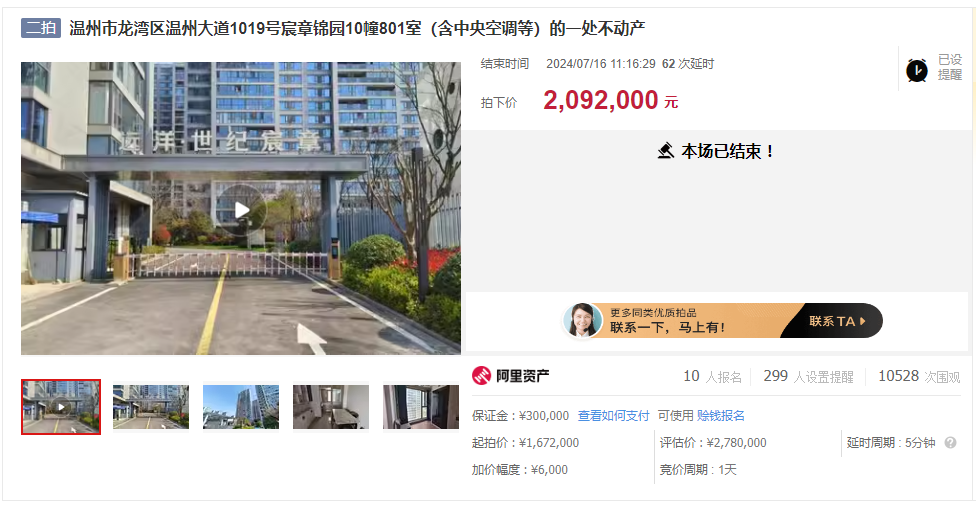 宸章锦园10幢801室,建面约131.75㎡,起拍价约167.2万元,起拍单价约1.27万元/㎡,吸引了10人报名,有299人次设置提醒,10528次围观。