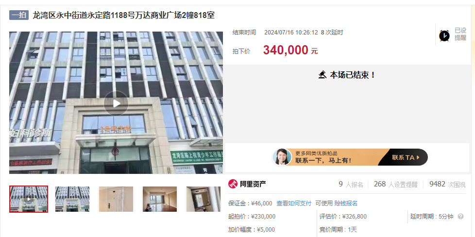万达商业广场2幢818室,建面约49.04㎡,起拍价约23万元,起拍单价约0.47万元/㎡,吸引了9人报名,有268人次设置提醒,9487次围观。