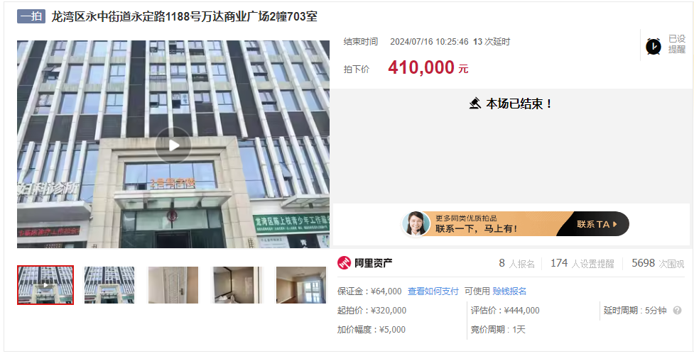 万达商业广场2幢703室,建面约60.89㎡,起拍价约32万元,起拍单价约0.53万元/㎡,吸引了8人报名,有174人次设置提醒,5698次围观。