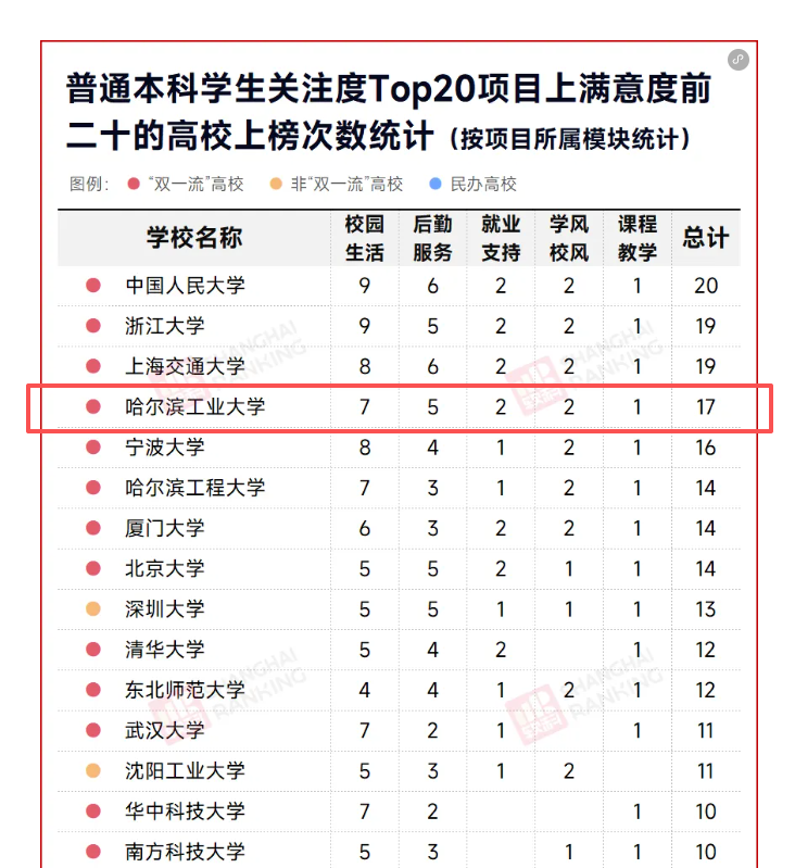 关于这个问题的答案,2025年7月发布的《2025软科中国大学生满意度调查》给出了最硬核的结论:大学好不好,真的只有在校大学生说了才算。在这份覆盖了全国2818所高校、回收了近15万份有效问卷的“民间大赏”中,哈尔滨工业大学像一匹披着重工业铠甲的黑马,在本科生最关注的20个项目里狂刷存在感,不仅总榜排名全国第四,更是在“对学生的管理人性化”这个含金量极高的模块中直接拿到了全国第一。