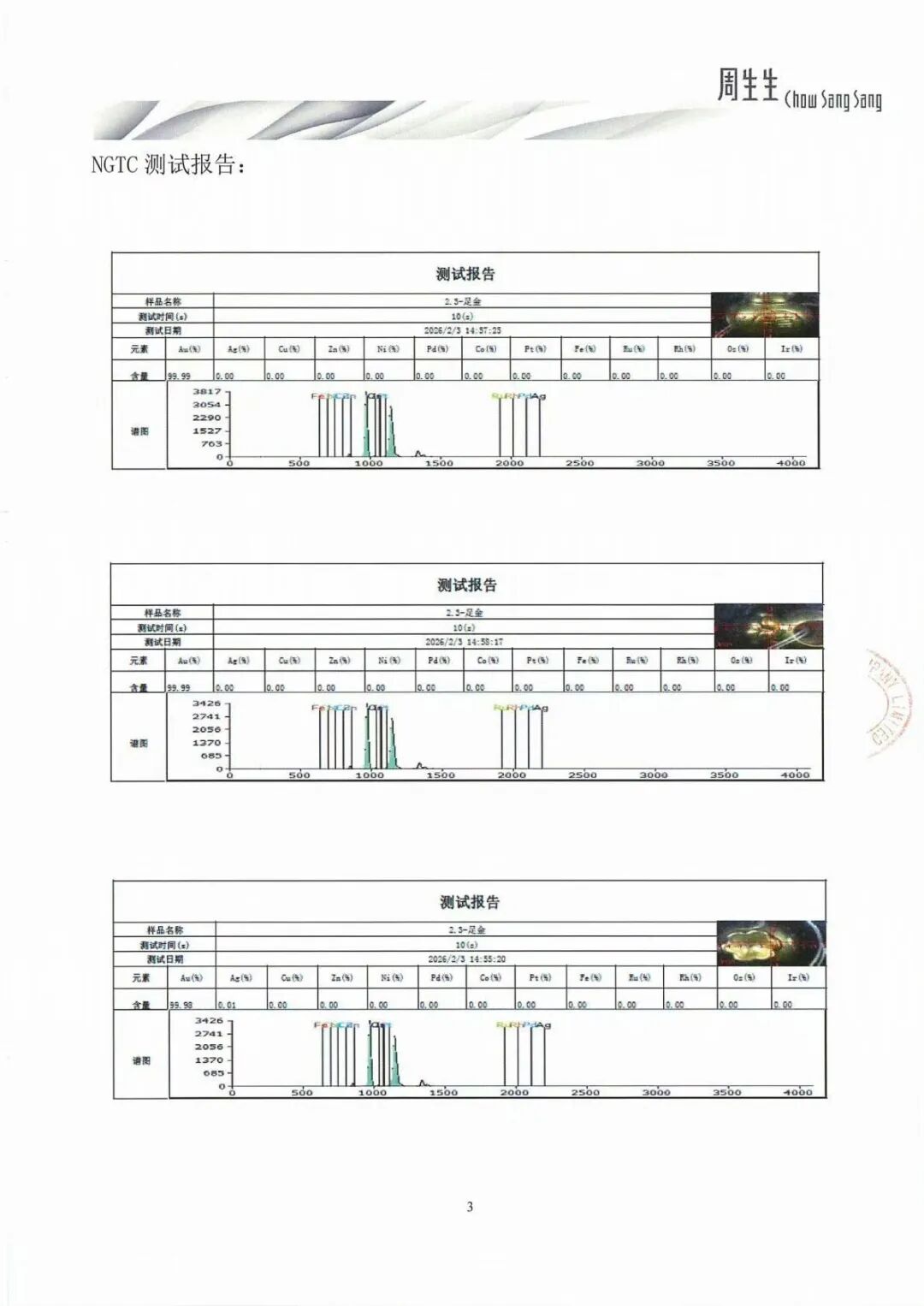 针对“足金挂坠被检测出含铁银钯”一事,2月3日晚,周生生晒出检测报告: