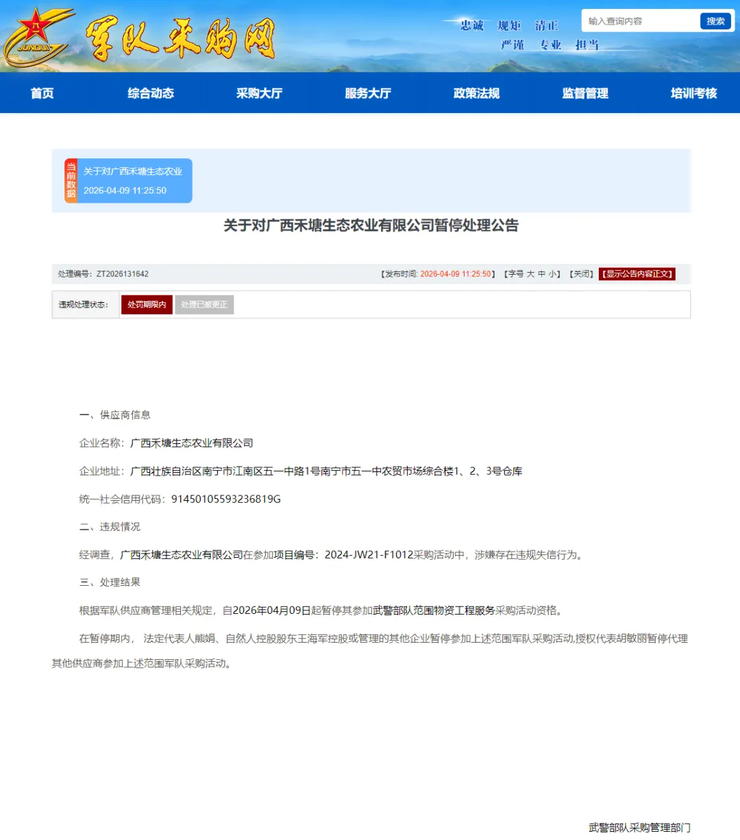 4月9日,军队采购网发布《关于对广西禾塘生态农业有限公司暂停处理公告》(ZT2026131642)。