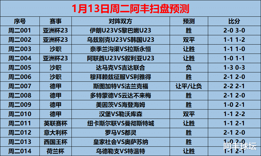 1/13周二赛事前瞻:德甲:多特蒙德VS云达不来梅(内附14场预测)