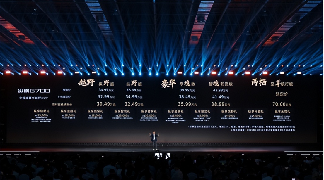 2025年10月19日,以“至 前所未至”为主题的纵横G700全球上市发布会在安徽芜湖宜居国际博览中心落下帷幕,作为纵横旗下首款量产车型,新车定位“全领域豪华越野SUV”,共推出4个版型,官方指导价为32.99万元—41.49万元,限时超级焕新价30.49万元起,并带来十大上市专属购车权益,旨在为用户提供从购车、用车到玩车的全链路尊享体验。作为纵横首张成绩单,G700的横空出世,正是纵横以技术创新打破边界,以品类创新定义豪华,以场景创新重塑价值的集中体现。而纵横更是以G700的全领域实力,成就中国汽车工业从大变强的新里程碑,引领属于中国、面向全球的豪华越野新时代。