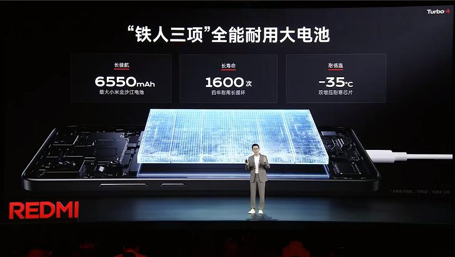同时,Turbo 4还配置了旗舰同款3D冰封循环冷泵,再加上狂暴引擎的加持,实测主流游戏、重载游戏满帧畅玩。Turbo4这次电池可以说相当大,达到了6550mAh,采用的是小米金沙江电池,也是目前为止容量最大的金沙江电池吗,支持90W有线快充。此外,Turbo 4还内置了双增压耐寒芯片,也是小米手机首次配置耐寒芯片,应对东北-35°C低温一点也不影响手机续航。