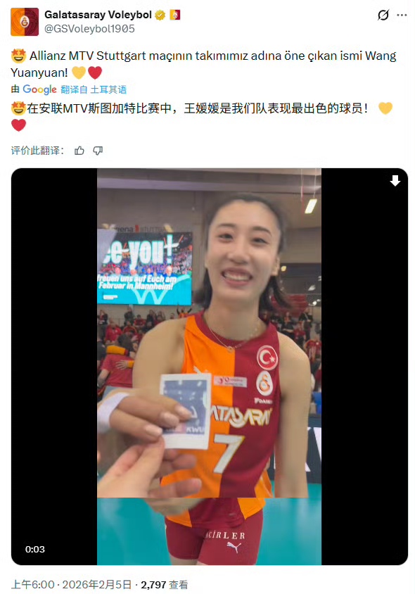 王媛媛14扣9中4拦,只有1个被拦,进攻端和拦网端都发挥了作用,在伤停了很多轮以后,塞拉也迎来了上场,主力球员逐渐回归,加拉塔萨雷的整体实力必然又会逐渐恢复,尤其是联赛当中,她们有希望把排名再提升一些。值得一提的是,在比赛进入到第四局,加拉塔萨雷24:23领先,球队一攻没有得分,关键时刻王媛媛通过拦网结束比赛,把比赛拖入到了决胜局,即便是决胜局输球,她们也能晋级,所以俱乐部官媒说她是“球队表现最出色的球员”,这必然是实至名归的。