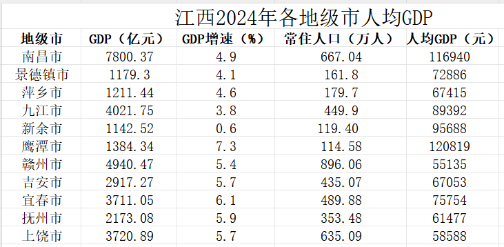 鹰潭市2024年GDP为1384.34亿元,常住人口114.58万人,折算下来,人均GDP约12.1万元。领先南昌0.4万元左右,高出全省平均水平4.5万元,更是遥遥领先其他地级市,比人均GDP最低的赣州市,高出6.6万元。也就是翻了一番都还不止。
