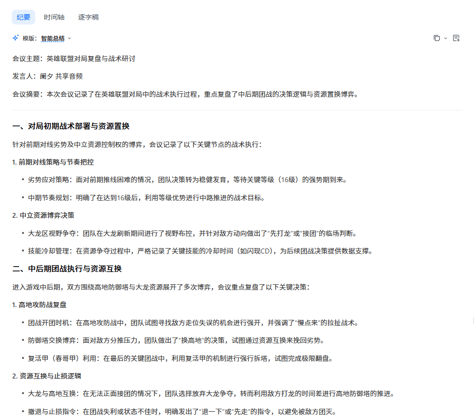 按照最常见的会议时间轴划分,AI可以根据语义,把逐字稿组合成带有重点总结的小段落,是临场感最高的方案;