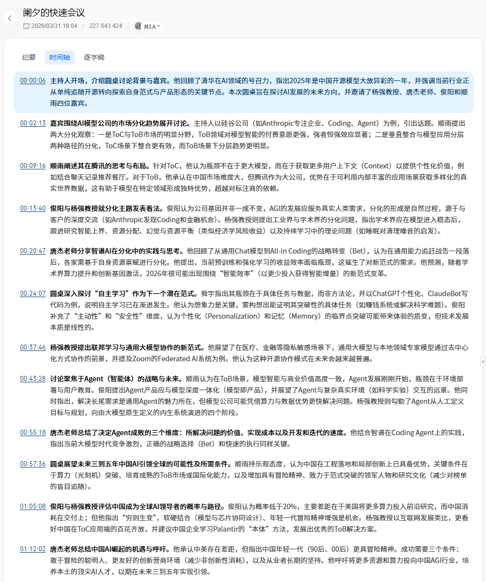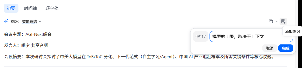 用户可以在纪要中的任意位置插入批注——突发灵感、主观判断、纠错直觉——这些笔记会跟会议内容长在一起,让会议资产随着人类的思考持续生长。