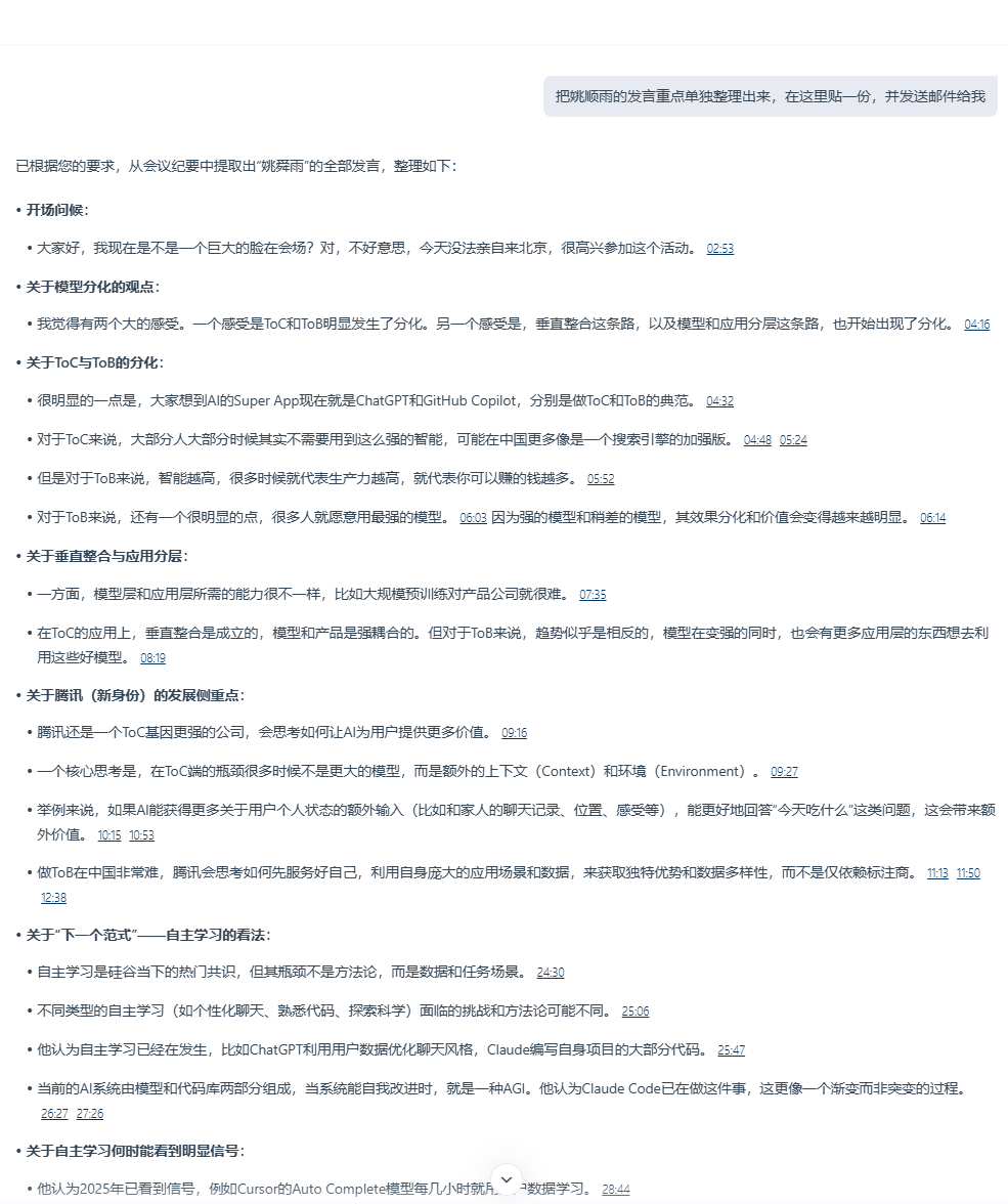 更加个性化的,是你能直接根据会议原文追问元宝,让它直接输出最符合心意的会议内容,比如对某人的发言特别感兴趣,就可以通过元宝进行一键总结,甚至让它帮你生成一封跟进邮件。