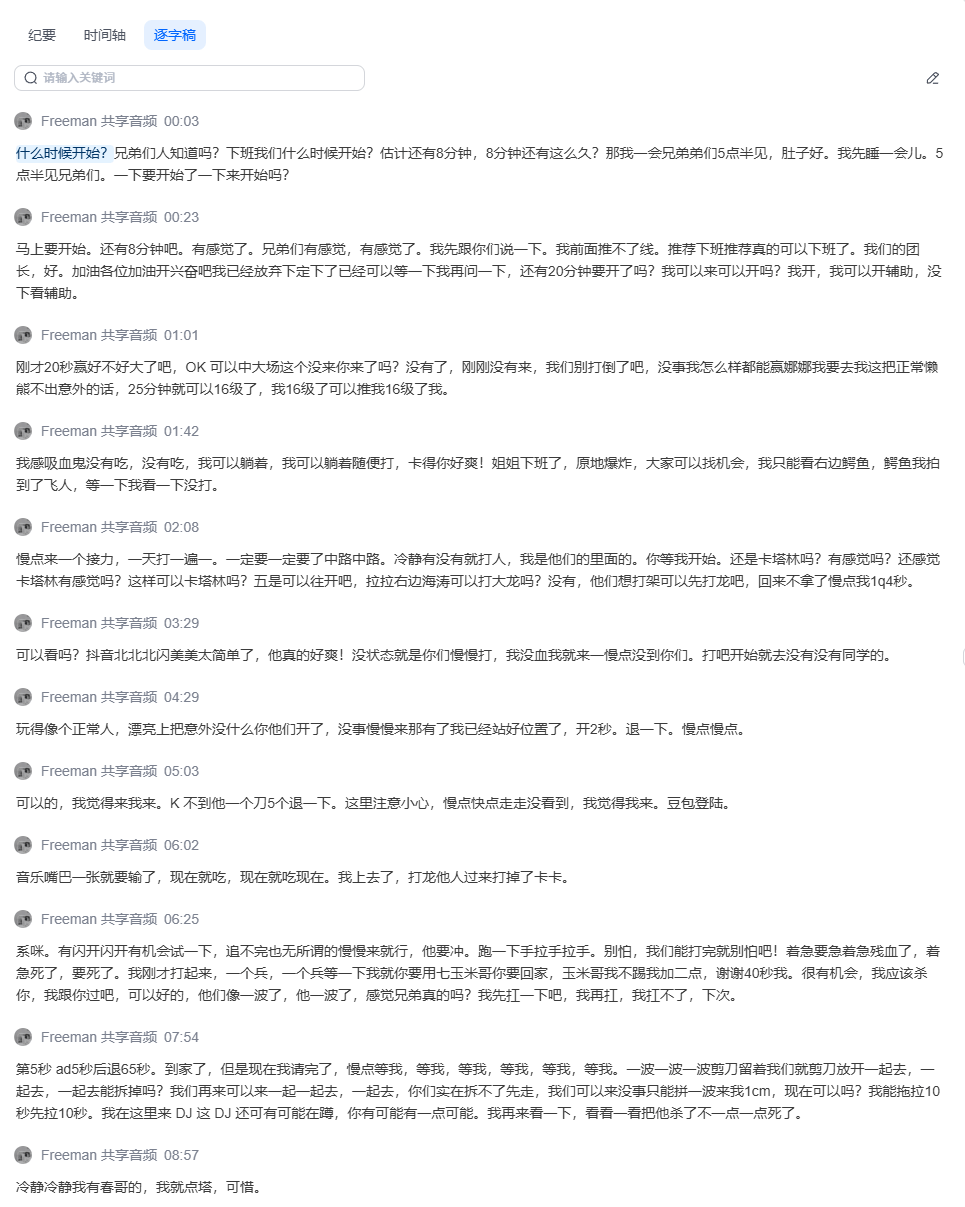 就我自己而言,也习惯了在跟朋友打游戏时顺带开着腾讯会议,几个小时下来,它会生成一份「会议纪要」,上面一本正经地记录着诸如「某人36次提出缺奶问题」「某人对队友操作提出批评性发言」这些细节,发到群里讨论,节目效果拉满。