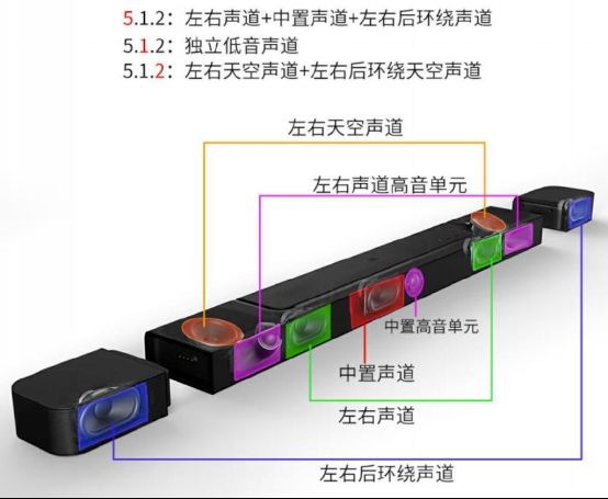 主流全景声回音壁多为5.1.2 或 7.1.2 配置: