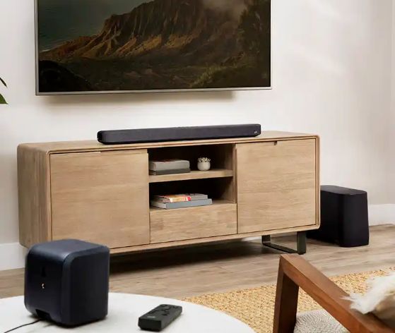 无线化设计是核心:后环绕音箱、低音炮与主条形音箱之间无需音频线连接,仅需插电即可自动配对(部分高端型号支持蓝牙或专用 2.4G 无线协议),把后环绕往沙发两侧茶几上一放,低音炮藏在沙发背后,视觉上完全隐形。