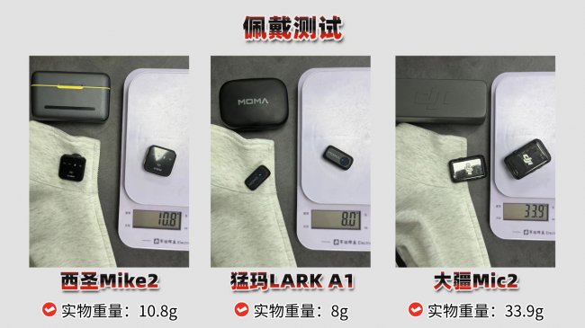 大疆Mic2发射器体积偏大,单机33.9克,夹子更宽,适合厚衣物,夹在薄T恤上会有点坠,移动拍摄时容易晃动,需要频繁调整,会打断拍摄节奏。五、总结部分
