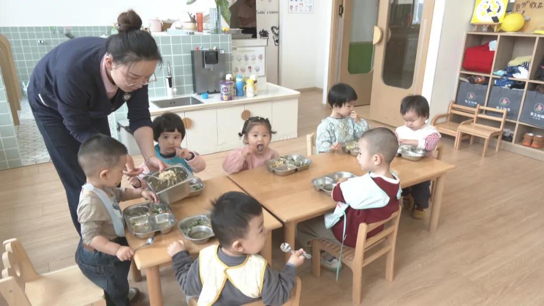该托育中心负责人邵芮介绍,机构按月龄分班,精细化设计每天的照护流程,体现在严谨配餐中,也体现在日常生活里自理能力的培养和社交启蒙中,用耐心和关爱陪伴孩子成长。