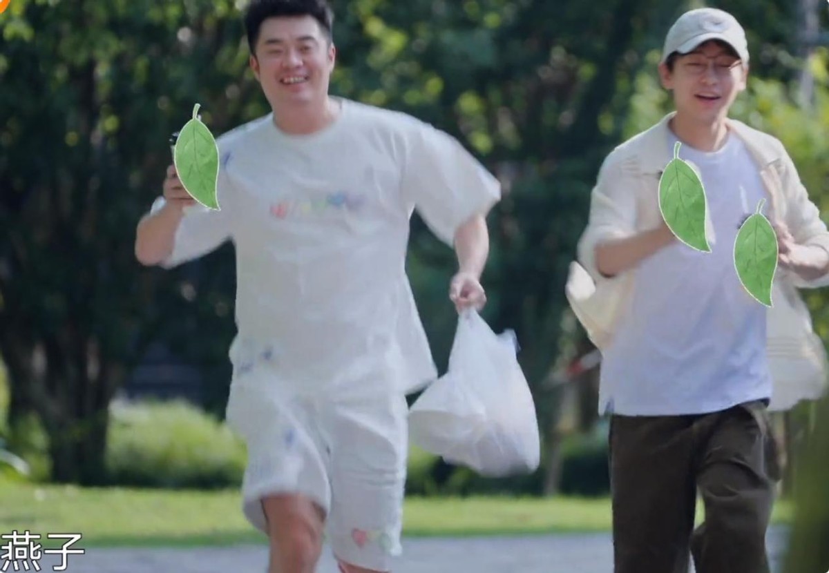 三人满地乱跑,高喊“燕砸——!”谭松韵在车里笑得前仰后合,黄磊在一旁吐槽。
