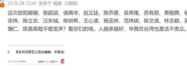 但依旧有小部分台艺人还是进行了表态,不过言语上是婉转的,不敢说得太直白,毕竟这两年那边的环境确实挺严峻的,好几位网红博主都落套了。
