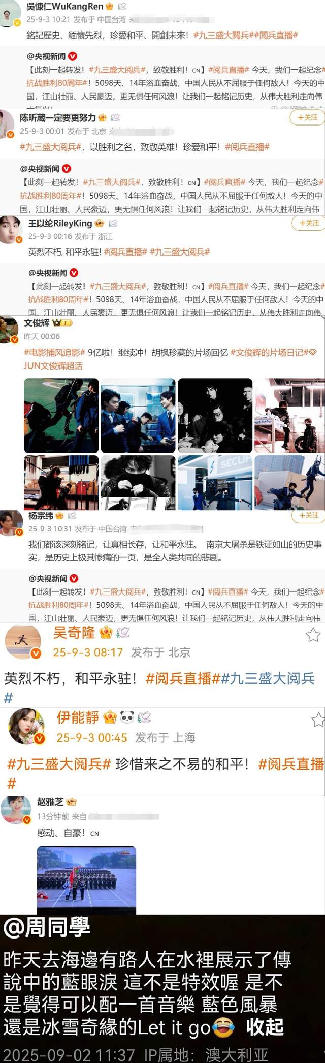所以,他们也不敢明目张胆,倒也情有可原。至于其他一些知名的台明星则是直接无视了这场活动,9月2日还在社交平台上热火朝天的宣传活动,发布各种动态。到了9月3日社交账号直接沉寂了,没有任何动静。