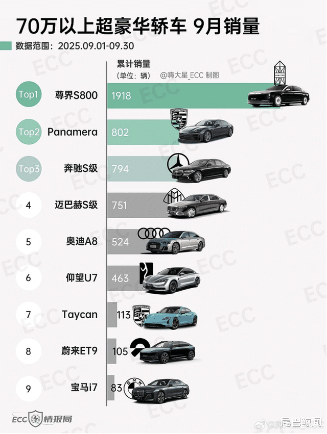 在最新的9月份70万元以上超豪华轿车销量排行榜中,一款来自鸿蒙智行的国产新车——尊界 S800,以1918辆的月销量强势登顶,不仅超越保时捷 Panamera、奔驰 S 级等传统豪华品牌,更以超过第二名一倍以上的“断层式”领先,引发关注。
