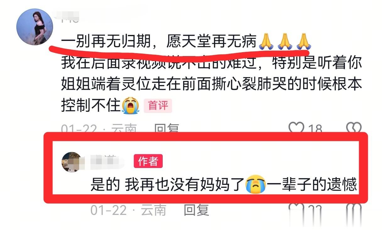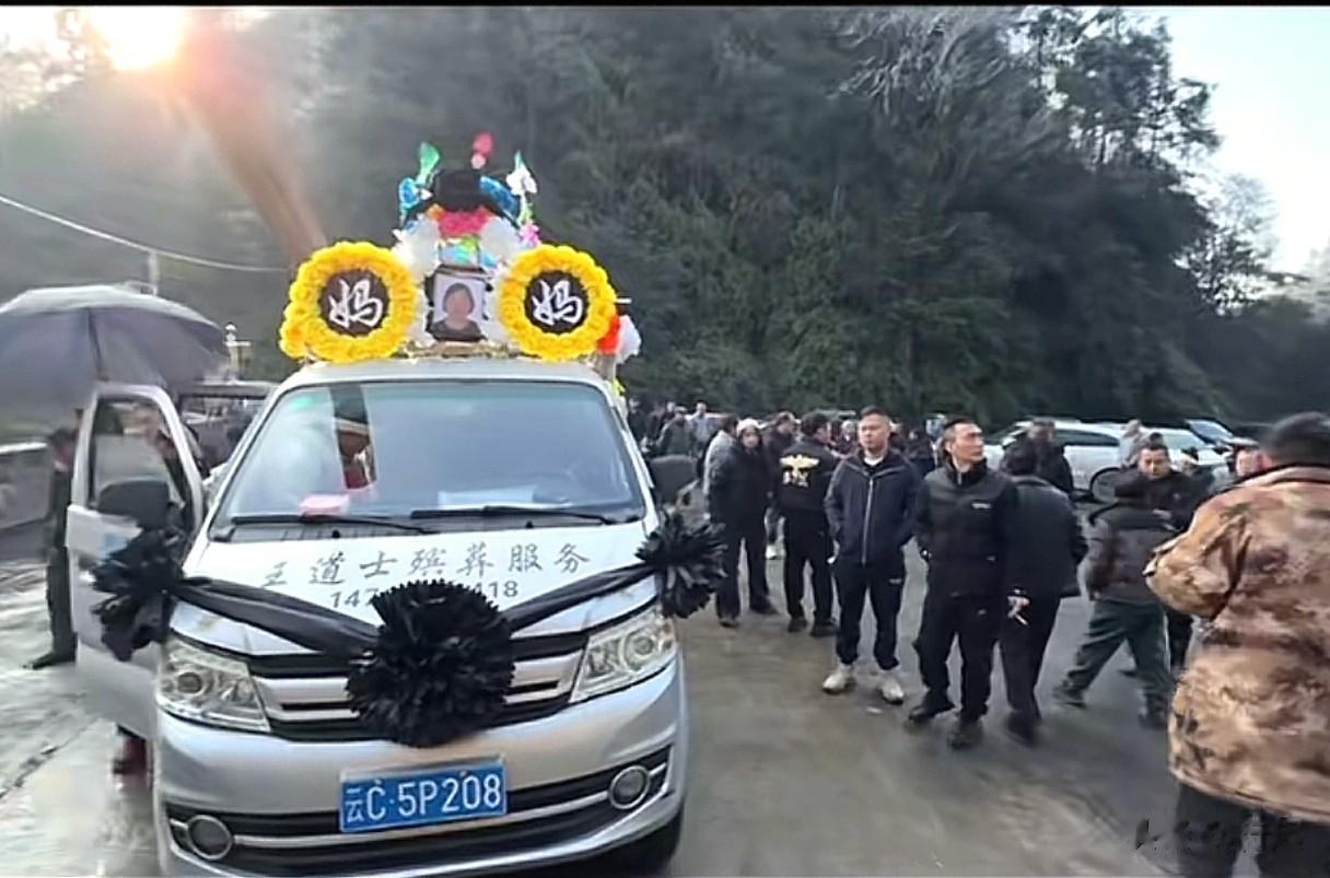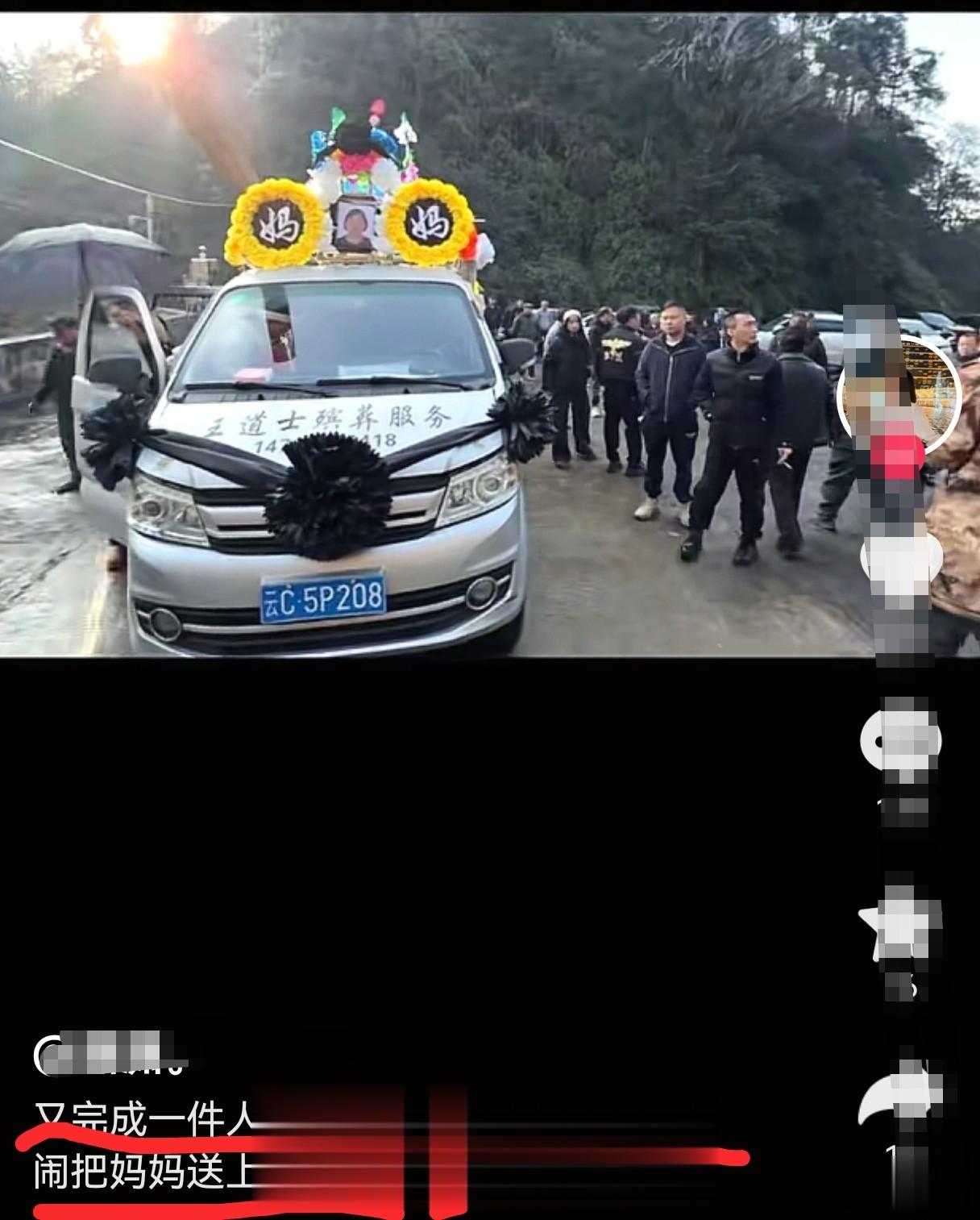 姐姐端着灵位,走在前头的妹妹哭得撕心裂肺,声音令人不忍听闻。她在配文中写道:“又完成了一件人生大事,丧事圆满,热热闹闹把妈妈送上山了。”