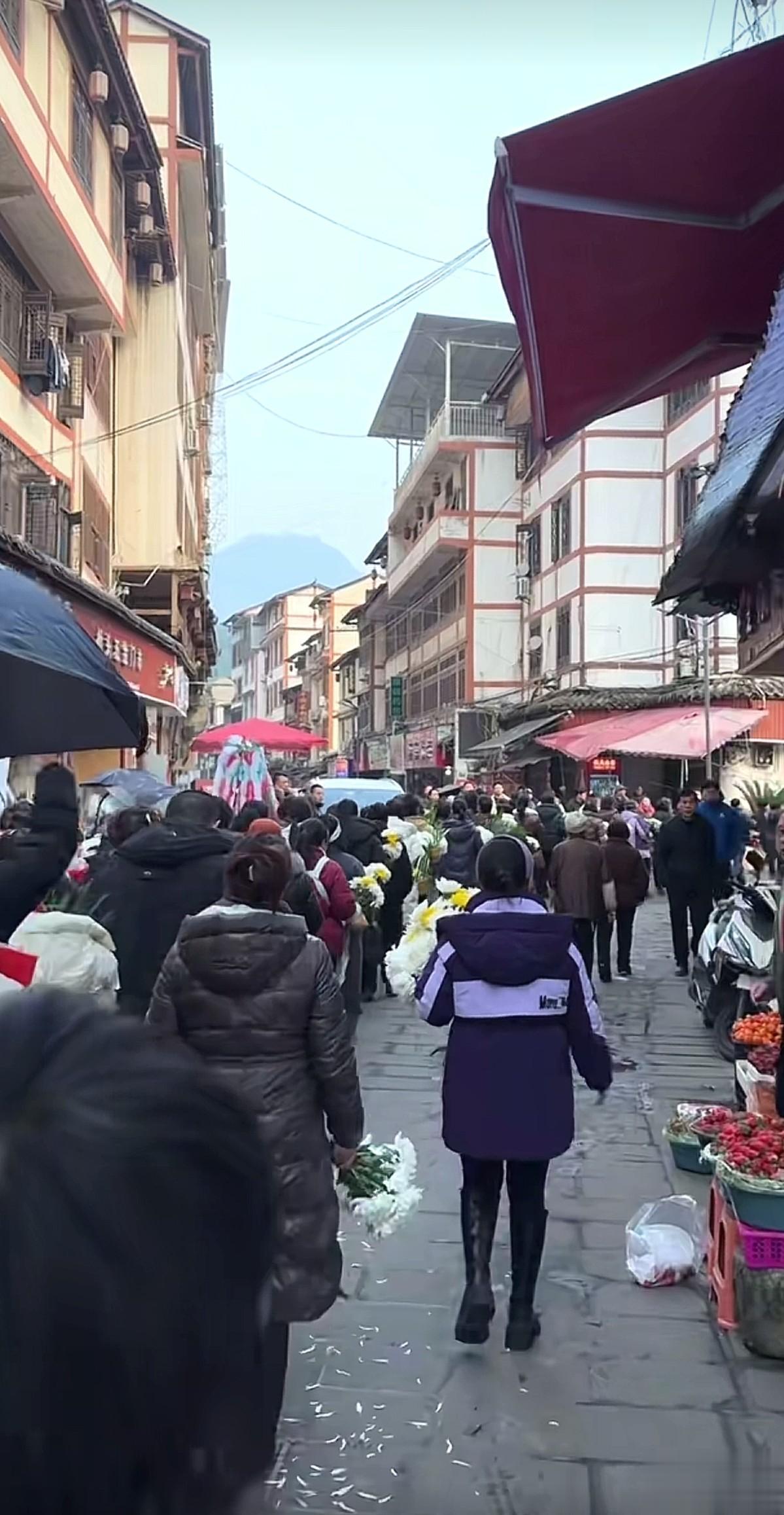 1月22日,博主“胡某”发布视频,送别了因病去世的母亲。画面中,送行的人站满了整个街道,大家穿着孝衣,手拿菊花,送别最后一程。