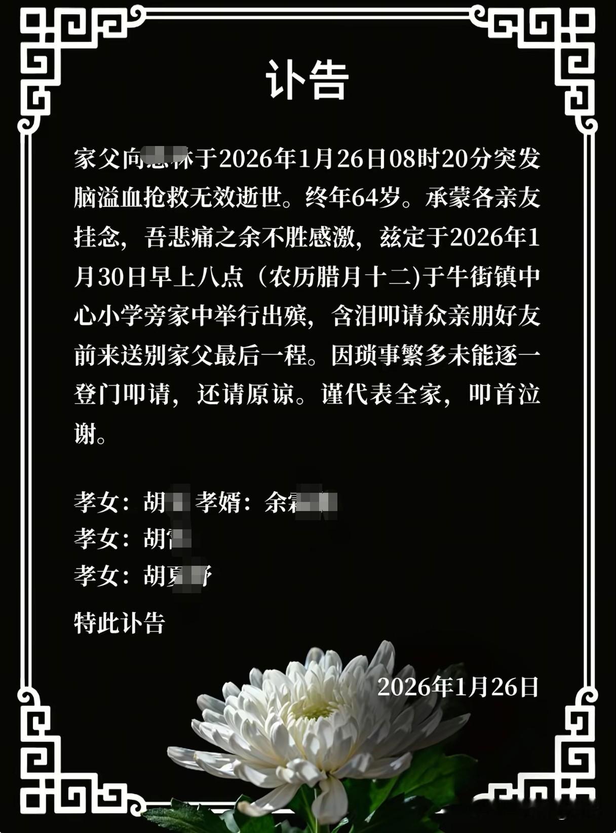 在讣告里我们得知,向某林终年64岁,于26日突发脑溢血抢救无效去世。按照一些地方的传统说法,这在短期内接连失去至亲,被称为“重丧”,对子女的打击是毁灭性的。