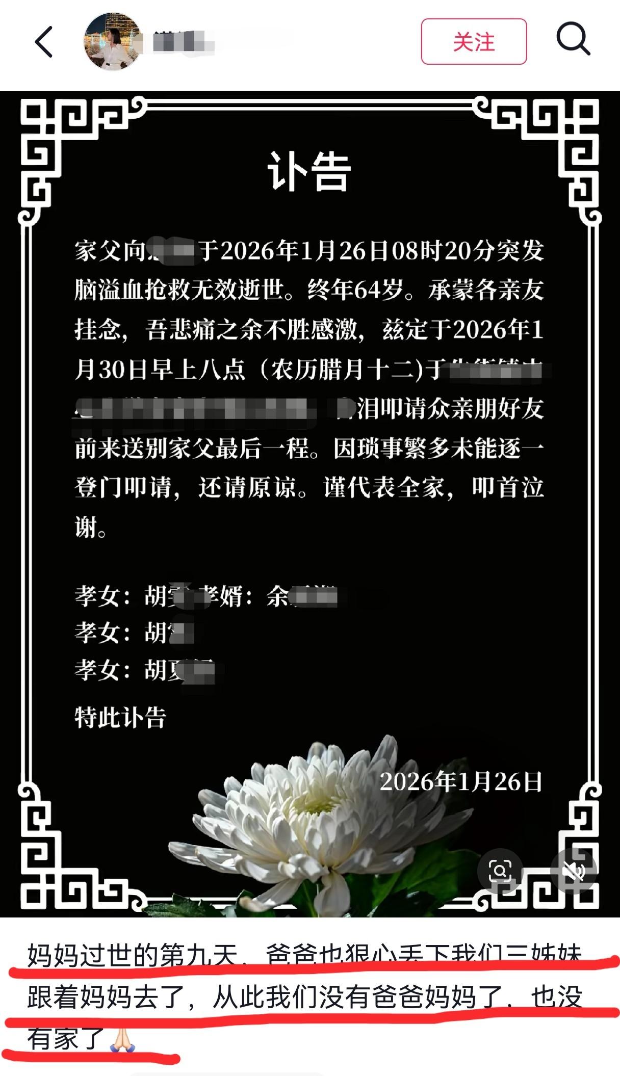 然而,命运没有轻易放过这个家庭,致命的打击接踵而至。1月26日,博主再次发出讣告,她的爸爸向某林在妈妈过世的第九天,也狠心地丢下了三个女儿,追随妻子去了。
