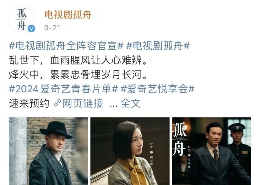 不用着急,一部大型间谍剧即将上映,《孤舟》于九月二十一日正式公布了自己的微博,其中桃家2024片单这部赫然在列,这一博文引发无数网友热议,我敢说这剧绝对是来拯救谍战剧市场的。