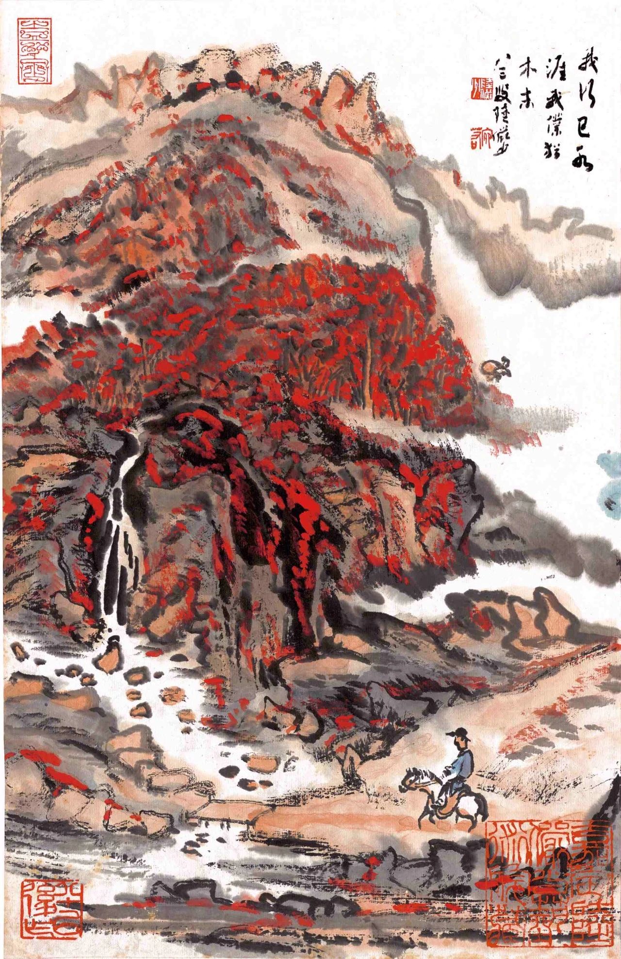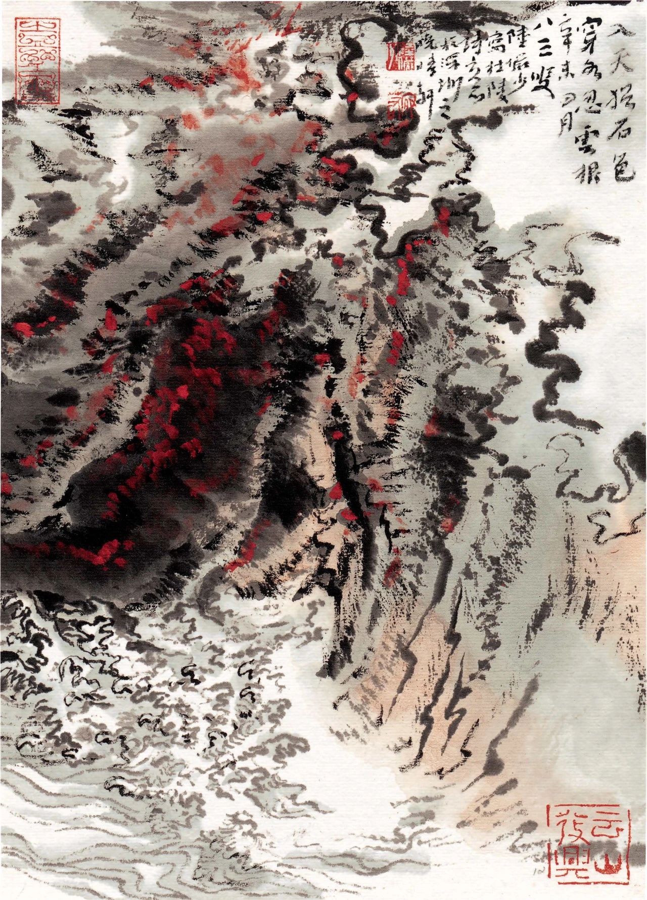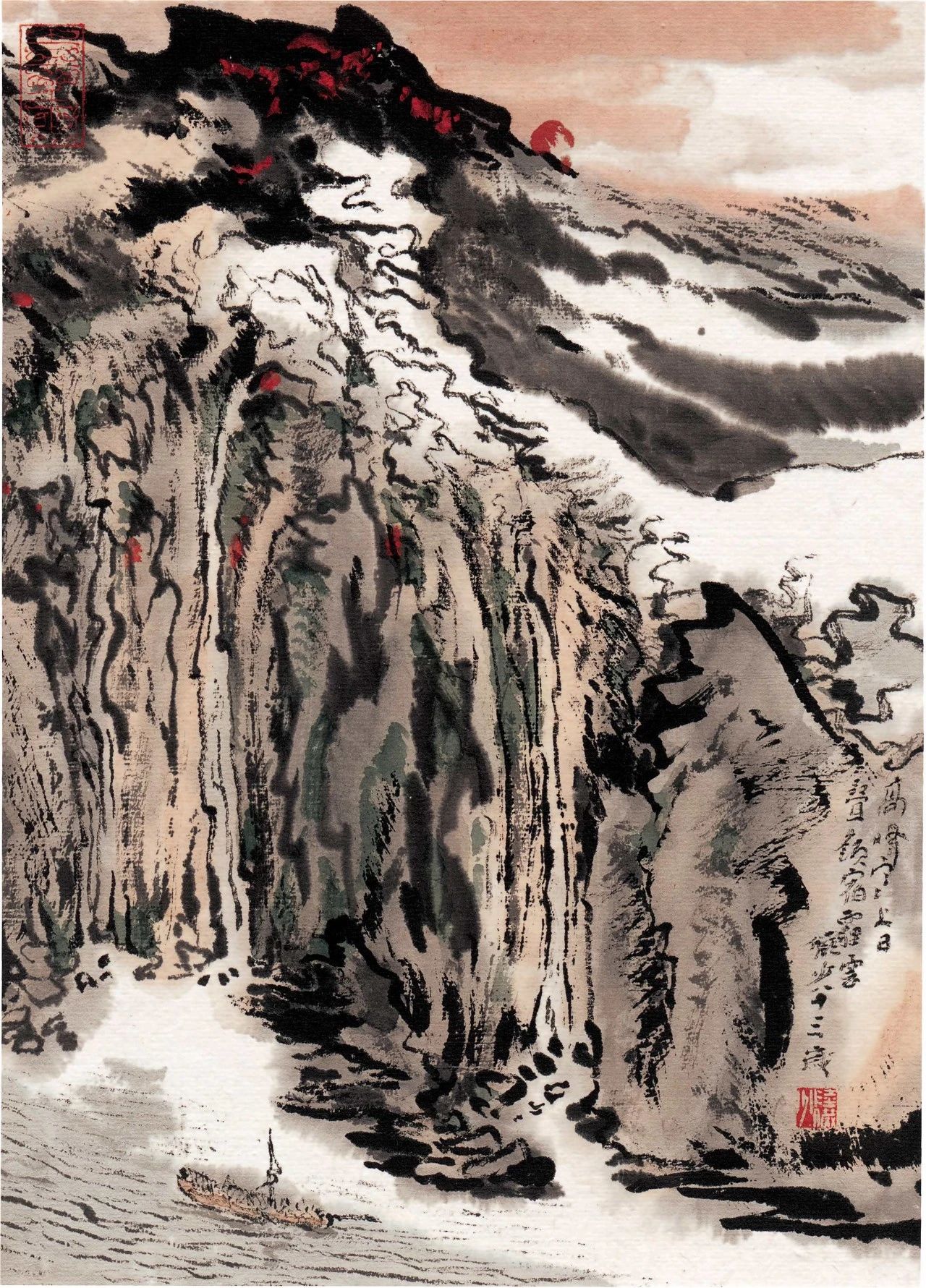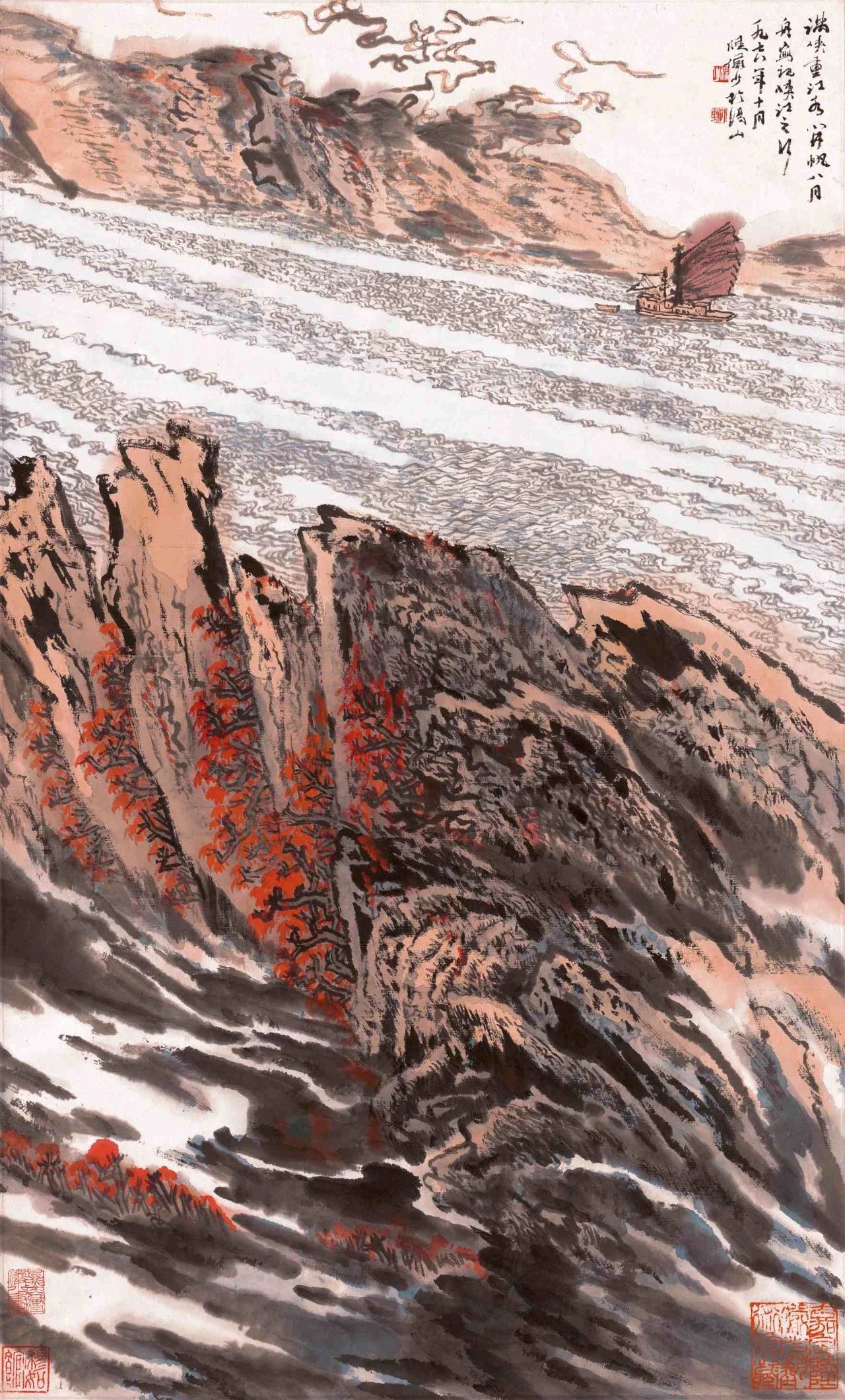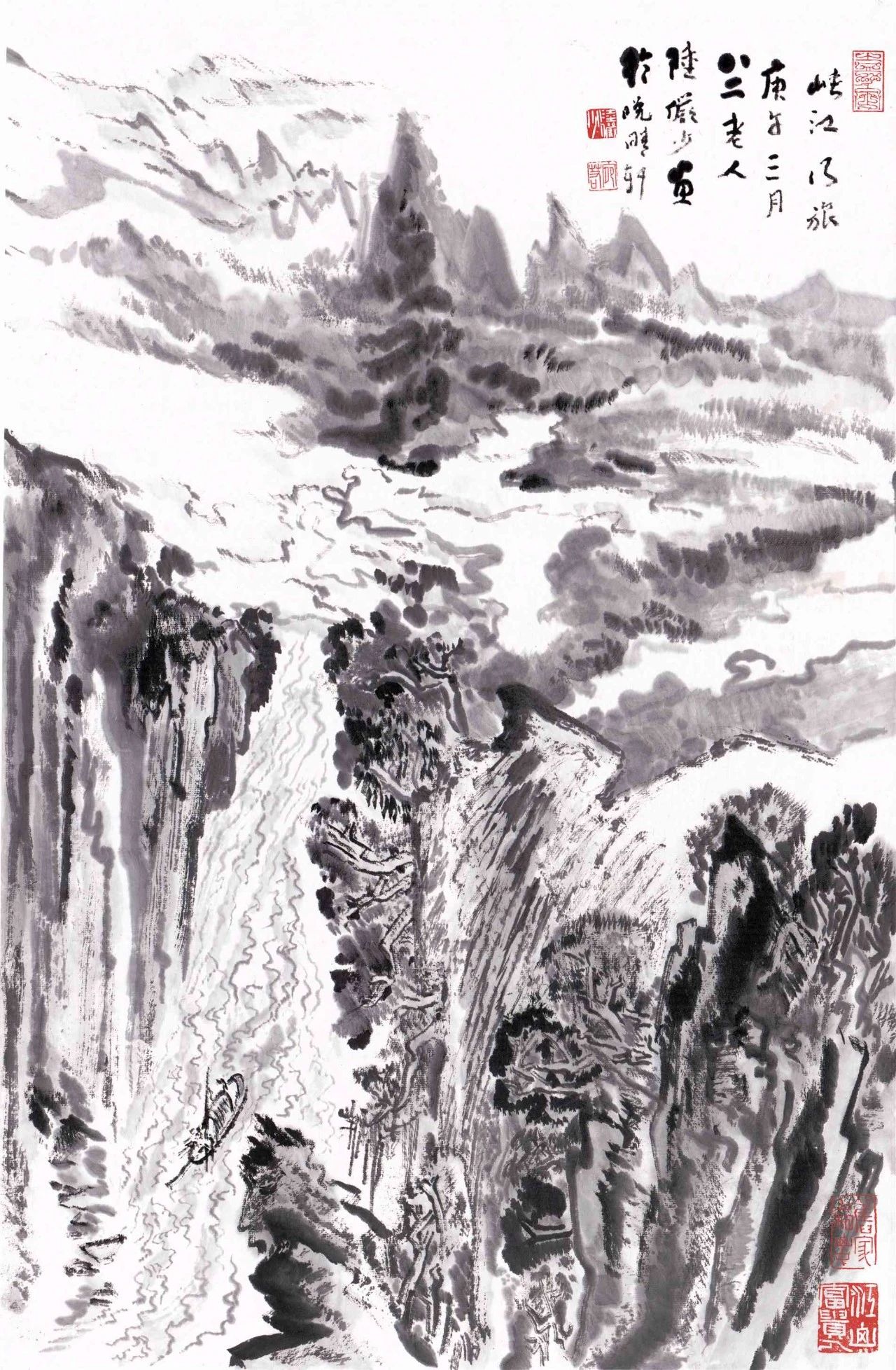 《峡江秋涛》这幅画作,既是他溯往追怀,寄托了自己对长江千难万险铭刻于心的生活感受,也是他尽情地勾画疾流奔泻、崩滩裂岩自然之美的江波万状,更是他创造如何用线条、墨块画云画水,得其动势,达神妙毫端、出神入化之境地的绝代佳作。《峡江秋涛》画面取立轴形式,取景高俊、刻意营造江峡之险险。画中半山腰里蜿蜒着数条首尾相衔的“白带子”,而这些白带子又与江面上大块面留白连通一片,画面顿时显得雾霭浮动、云水相连,不多费笔墨晕染,而苍茫气象已成。留白的运用,充分体现了中国山水画虚实相生、以静寓动的特点。
