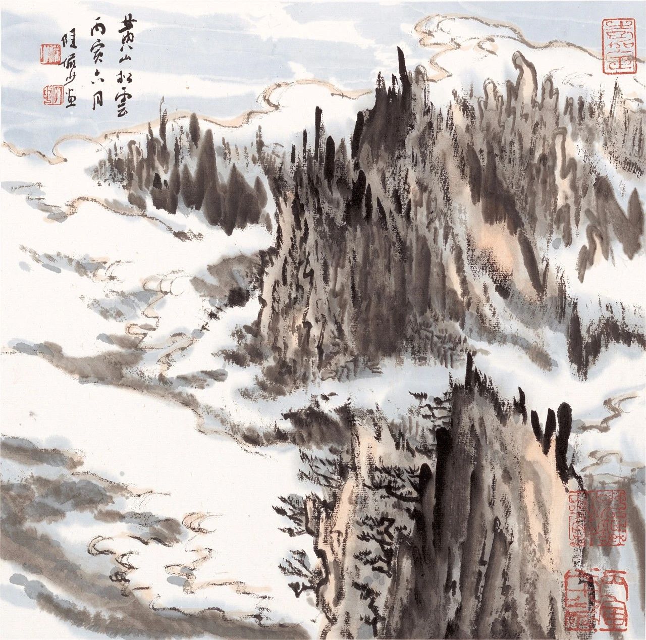 勾云法,陆先生运笔自如;流畅飞扬,增加画面的表现精神,又极其具有飞动之气势,而且,对于云之阴阳两面,以墨之浓淡表现而出,泾渭分明。块云法,以积墨成块,层层叠叠,或以线条勾之;或下笔审时度势,计白当黑,回环反复,留白之处恰到好处,自然之极!更为精彩的是,勾云与积墨二者共用,山石前用墨积蕴,而山石后又以线勾烘而出,动静分明,极具神采,气象万千。