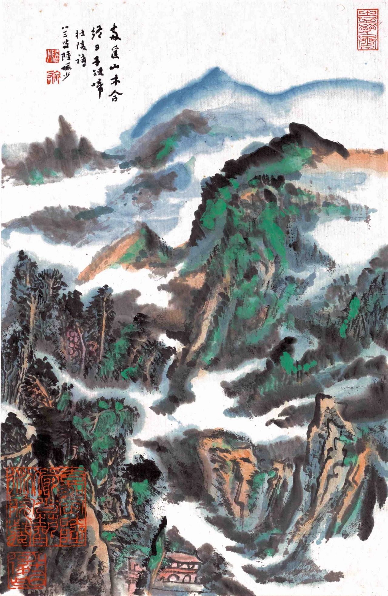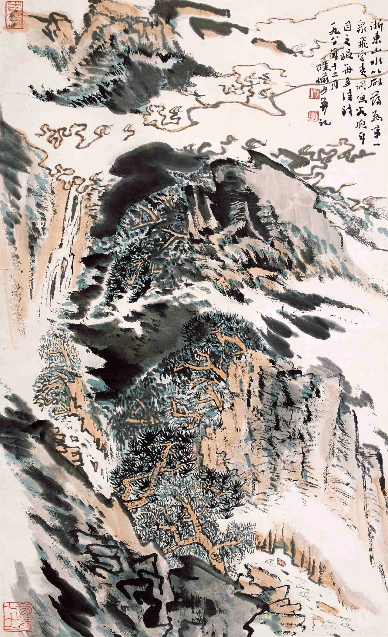 《云岩飞瀑》陆先生后期的山水,通过结构的排比和间隔的组合而形成气势雄阔拓展之势。他的画,或是阴阳虚实对比强烈,结构简练;或是重山复水层层推远,境界阔大。此幅绘于1981年的《云岩飞瀑》,是应当时全国人大常委会副委员长、国务委员,前国务院副总理耿飚同志所作,为作者创作成熟时期的代表性作品:饱满的画面,尽显山势的巍峨雄奇;勾云勾水间,展现云雾缭绕的仙峦意境。作者以长线条描水勾云,山体同样笔致清晰,笔笔见笔,起落有致;山中茅屋几间,掩映于苍树中,一派远离城嚣、悠然世外之态;湍湍水流之上,一座木桥连接两崖,与山中茅屋相呼应;敷色则注重浓淡干湿,繁简轻重间极尽变化。